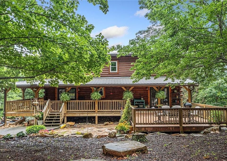 Tucked away behind a gated entrance on three wooded acres, this custom log cabin delivers the kind of peace and privacy that’s getting harder to find. Every detail from the rocking-chair front porch and landscaped exterior to the wraparound deck, every inch invites you to slow down and settle in. Inside, the open-beam ceilings, wide plank walls, and hardwood floors set the tone, warm, rustic, and timeless. The main home features a spacious living area with soaring ceilings and skylights, a kitchen finished with granite counters, cherry-stained cabinets, and stainless steel Whirlpool appliances, and a main-level bedroom with a beautifully updated bath featuring a marble-topped double vanity and clawfoot tub. Additionally, there is a separate guest house featuring a full kitchen, living room with a bed and bath, making it perfect for extended family stays, rental income, or a tranquil office setup. It also includes a spacious storage room. And if you're bringing animals, the barn and fenced paddock are ready to go. Surrounded by other homes on acreage, this property blends privacy with a true sense of community just far enough out to feel like an escape, yet still within reach.