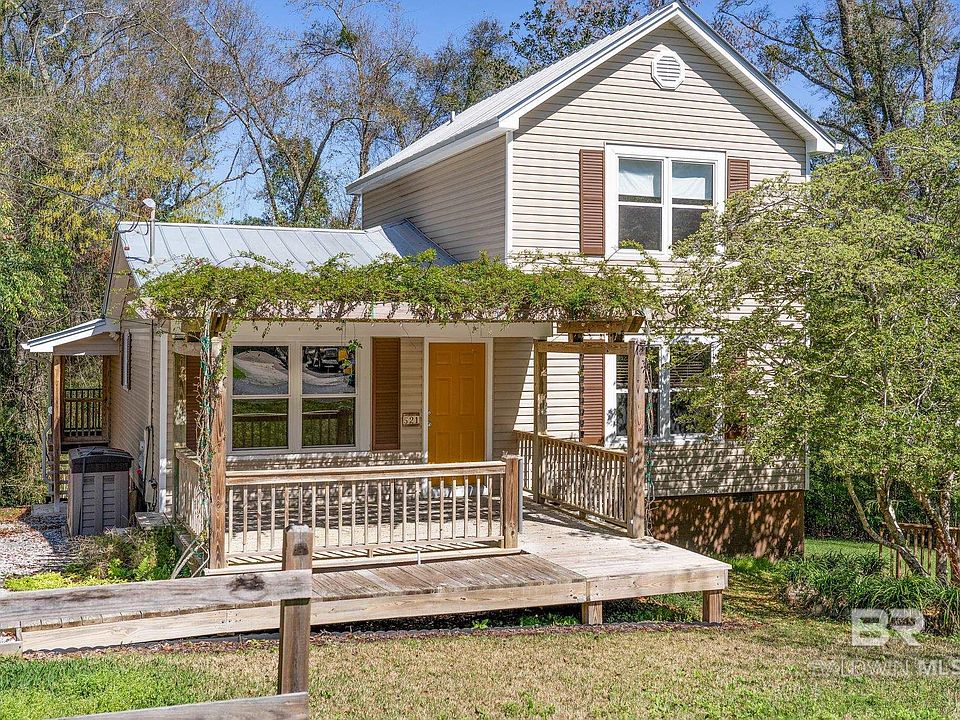 At the end of a private, peaceful cul-de-sac sits 521 Equality Avenue, a serene retreat within walking distance of the many amenities that characterize the enchanting town of Fairhope, one of the South's most award-winning and beloved communities. A substantial wooden arbor with beautiful blooming Hurricane Katrina Roses shades the front door. Once inside, you'll find the open and inviting floor plan comfortable and smart. The heart of the home is the spacious living room and its adjacent, well-appointed kitchen and a convenient half bath. Just beyond the kitchen is a generously sized "flex" room which leads to one of the home's standout features -- a secluded screened porch overlooking the Bayou Charbon gully and spanning the entire length of the back of the home This tranquil outdoor space, an extension of the home's living areas, provides an ideal spot for morning coffee, al fresco dining, or a quiet space to sit and enjoy nature's sights and sounds. The primary bedroom with an en-suite bathroom is also located on the main floor. Ascend to the second floor and discover two additional bedrooms and a full bathroom. Other notable features include updated windows, mostly wood and parquet flooring, smooth ceilings, recessed lighting, an abundance of crown moulding, an interior laundry room and a SmartWater filtration system. Once outside, notice the 20' x 21' Capital Steel structure offering shelter for automobiles, water crafts or Fairhoper's preferred mode of transportation -- a golf cart. Don't miss the workshop area on the home's East side which also provides access to the crawl space. Recently AFS Foundation and Water Proofing Specialists performed a life-time guaranteed crawl space encapsulation with a dehumidifier and a pump. Schedule a visit today and come see for yourself why 521 Equality Avenue strikes the perfect balance between seclusion and convenience.