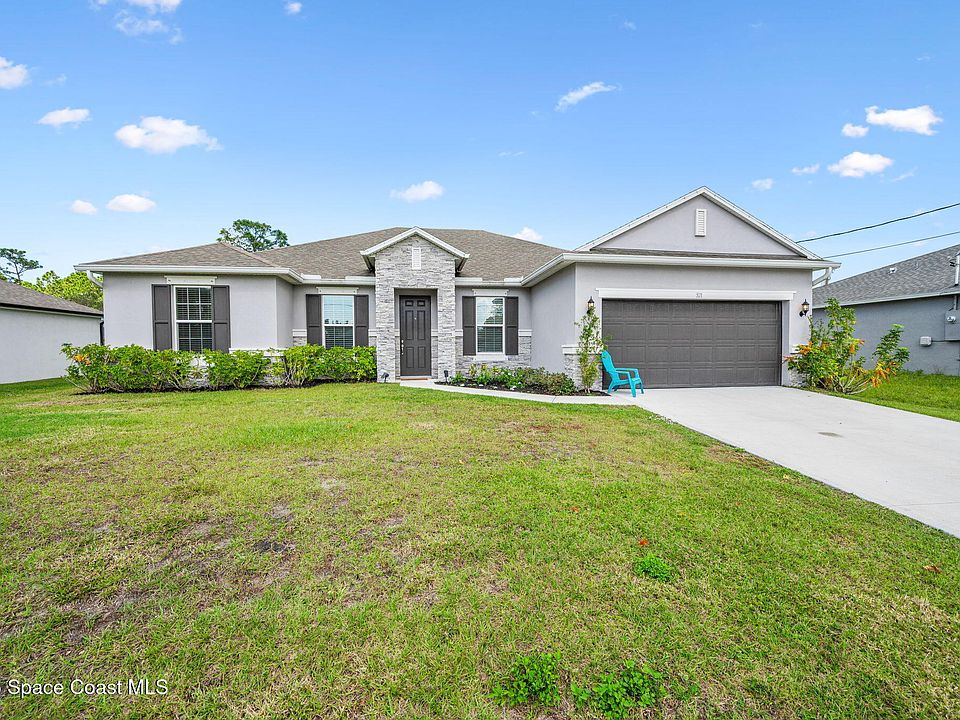 Welcome to this beautifully designed 4-bed, 2-bath home in Palm Bay. Built in 2020, this home offers elegance & a functional layout perfect for families and professionals alike. Impressive curb appeal with stone-accented columns at the entryway. Open-concept layout that connects the living, dining, and kitchen areas. A flex room provides additional versatility, perfect for a home office or playroom. The heart of this home is its modern gourmet kitchen, thoughtfully designed with white quartz countertops, mosiac backsplash, white cabinetry and SS appliances. Not one, but TWO pantries, a valuable feature. Throughout the main living areas, you'll find gray wood-look tile flooring. The bedrooms feature carpet while the upgraded wall palettes throughout the home give it a modern feel. Primary bath is huge and has a walk in shower with mosaic floor tile. Double vanities at the perfect height for convenience. Plenty of storage & counter space. Spacious backyard. City Water & Septic.