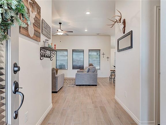 Home has been immaculately maintained, upgraded and kept by its owners since it's construction in 2018 by Taber Homes. This Hazel floor plan has 4 bedrooms (4th bed is currently an office), 2 bath and large 3 car garage. The color palate is light, bright and inviting. Enter the home and immediately notice the oversized granite island in the kitchen with tons of storage. The master bedroom and laundry room connect efficiently on one side of the house with all other rooms on the opposite side. Large and private backyard is great for kids and entertaining! Upgrades and features: storm shelter, LED bulbs throughout, tankless hot water heater, leather grain granite in bathrooms, exterior fireplace with natural gas hookups for grill, full sprinkler system (perfectly tuned by owner). TECH UPGRADES: 6-camera 1080p IP camera system, hard wired. Wireless access point for upgraded wifi, data points in office, computer exhaust vents in ceiling of office (can be removed). Impressive home!