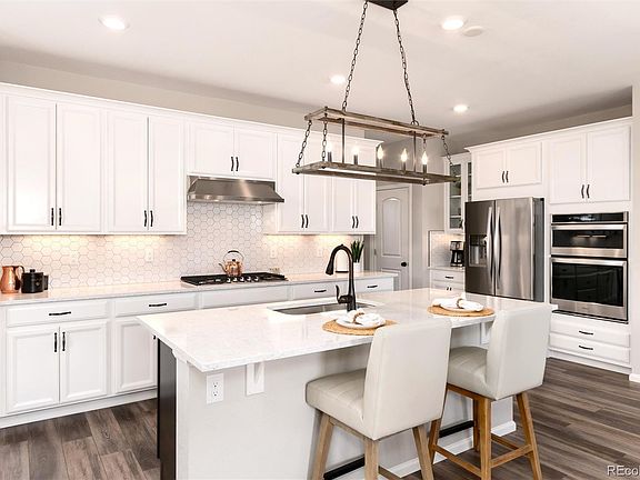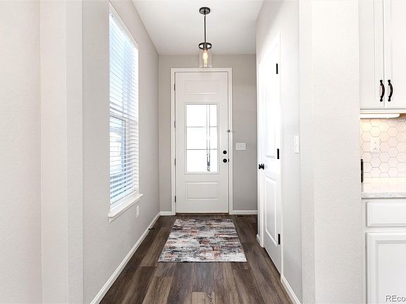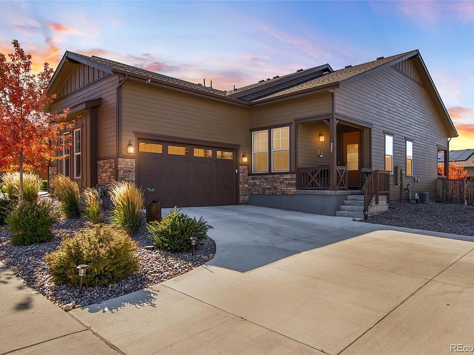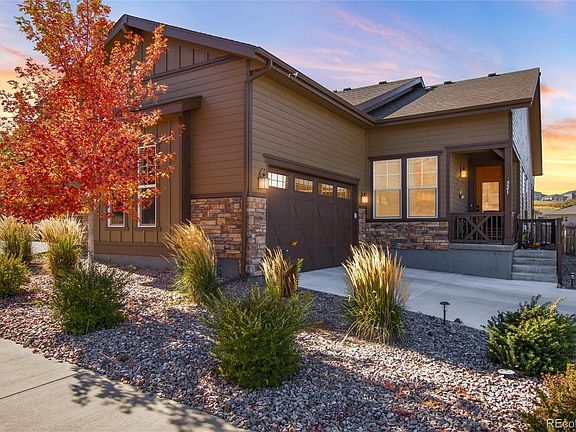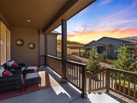 This delightful Castle Rock home is situated on a large, quiet, cul-de-sac lot, adjacent to open space, in a pleasant and charming paired-home community. LOW MAINTENANCE, LOCK-AND-LEAVE living here with its extensive xeriscaping front and back and, best of all, no snow shoveling! The HOA takes care of all driveways and sidewalks (over 3”)! This near-new home is for those that appreciate an easy, active, lifestyle without compromising on upgraded, modern amenities! The open floorplan offers an expansive and upgraded kitchen with an oversized quartz countertop island, modern honeycomb tile, and under-cabinet lighting - so beautiful! The dining room and living room are drenched in sunshine with a “wall of windows” and 8’ door leading out to your huge covered deck. Perfect for relaxing summer evenings watching the sunset and deer walk through the nearby open space. You’ll enjoy a generously sized primary suite, complete with a large walk-in shower, quartz countertops, and walk-in closet. The 2nd bedroom is perfect as a den or a guest room, with the full bathroom just down the hall. The newer washer and dryer are included in the dedicated laundry room. Storage is not a problem here with its huge double-door hall closet, plentiful coat/linen/bedroom closets, crawlspace, and tall garage ceilings! Other upgrades include luxury vinyl plank flooring, upgraded ceiling fans, light dimmer switches, window shades and curtains, irrigated garden beds. The Terrain offers 2 community pools, tennis courts, a dog park, playground/park, miles of trails and open space, and is close to Castle Rock’s rec center with an active senior community. Discover historic Downtown Castle Rock, featuring plentiful restaurants and boutique shops! You'll feel like you live in a small town with Castle Rock's Concerts in the Park, Farmer’s Market, Yoga in the Park, Parade, Cattle Drive, Fair + Rodeo, and more! Come live the good life!
