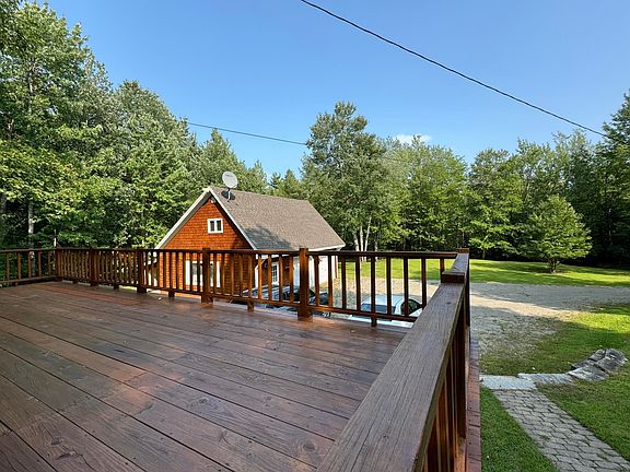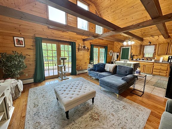 Wow! This place is nice, and it could be yours. This well-maintained chalet style home has much to offer on an appealing 2-acre wooded lot. Curb appeal is in store with this property from the rolling lawns to the granite wall & roadside fence. With its warm mahogany glow, this home is just as inviting inside as it is outside. Find a bright & open living room & kitchen w/ cathedral ceilings, heat pump w/ AC & 2nd floor loft. First floor primary bedroom w/ office & full bath. The lower level offers a family room or 2nd bedroom w/ NEW full bath, wood stove & views of the yard. Outside find a storage shed & detached two-car garage.