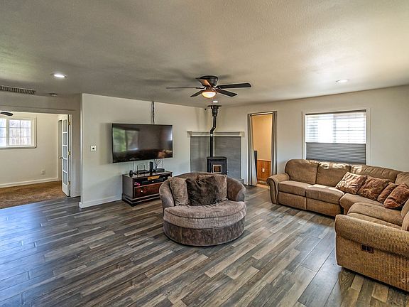 Prime Investor or 1st Time Buyer Locale. Back on the Market at no fault of seller. Upgraded & 'Move In Ready', A high-demand area; central 'In Town' location with easy access to shopping, dining, golf, and trails. The home is set back, up off of the road, affording the feeling of seclusion and the enjoyment of distant mountain views. Both front and rear fencing, with wrap-around grounds. The grounds offer multi-access points to the home, for year-round convenience & enjoyment. The front room features 2 'picture windows', easy maintenance laminate flooring, recessed lighting, & a pellet stove. From the living room, there is EZ access to a 'sunny' kitchen on one side & a bonus room w/wet bar on the other. The bonus room features a custom island, slate tile flooring, full laundry, a french door to the rear grounds & acces to garage. The bathrooms & kitchen offer convenient upgrades, all in neutral decor. The 3rd bedroom features french doors, offering an option to be used as a den. The outbuilding includes power: a tool shed, or a playhouse ? In addition to the garage, there is add'l parking next to the garage, & on the long driveway. Make arrangements to visit the best-priced 3 bedroom with In Town Ease.