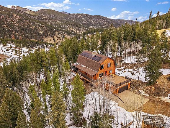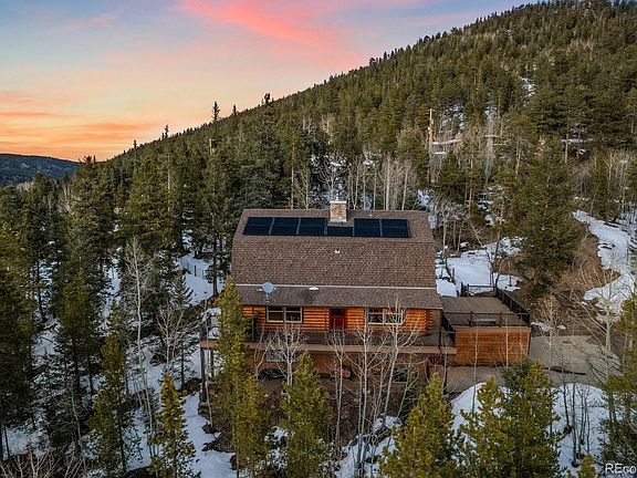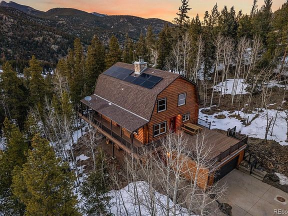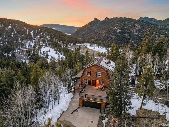 Embrace the mountain lifestyle in this beautifully updated log home, situated just across the road from Golden Gate Canyon State Park. Each window in this welcoming abode offers breathtaking views of aspen groves, pine forests, rugged mountains, unique rock formations, and abundant wildlife. Tucked away on nearly 5 acres, this secluded retreat provides a peaceful ambiance, nestled off a well-maintained county road. The main level's open layout, perfect for entertaining, seamlessly connects to a spacious deck on two sides. The home's versatile floor plan adapts to various lifestyle preferences, whether you enjoy hosting gatherings in expansive spaces or seeking quiet moments in cozy corners. Recent enhancements include new carpeting throughout, upgraded windows and doors, and updated electrical wiring completed in fall 2023. The interior's log construction and accent walls exude a cozy warmth, amplified by ample natural light. The exterior logs have been meticulously sandblasted, chinked, and stained, enhancing the home's rustic charm. Included with the property are a playhouse and firewood storage, along with roof solar panels for eco-friendly energy solutions. Nearby public lands offer endless opportunities for outdoor activities, making this home a haven for nature enthusiasts and adventure seekers. This home embodies the perfect fusion of natural beauty and modern comfort, delivering a distinctive Colorado living experience that is both serene and inviting. Conveniently located less than an hour from DIA, 25 minutes to Golden, 20 to Black Hawk, and 40 to Downtown Denver, this residence combines tranquility with accessibility. Contact us for a showing today! **For a closer look, explore the drone and walk-through video, floor plans, and additional photos at: https://qrco.de/bewAuz **