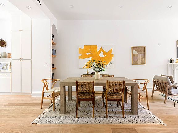 Enter into a gracious foyer and into a sun-soaked living room where soaring ceilings and wide-plank oak floors set a tone of warmth and elegance. Natural light highlights refined finishes and artisanal craftsmanship, while an original fireplace marble mantle adds charm and ambiance.