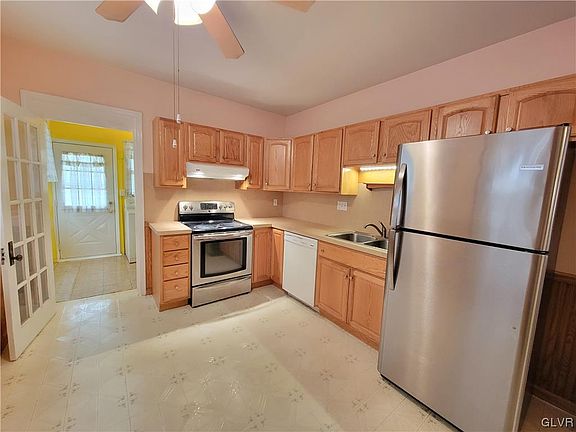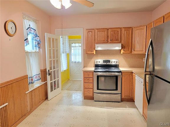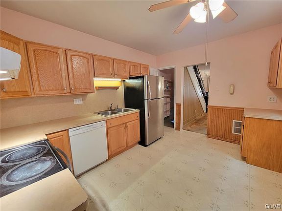 Large 5 bedroom 1 bath home with fenced yard and covered front and back porch. This home has an updated kitchen with stainless refrigerator and stove, double sinks, disposal and dishwasher. The bathroom has been replaced and has a one piece fiberglass tub and all new fixtures and a linen closet. The home is heated by oil, hot air heat and cooled with ceiling fans. The laundry/mud room is located on the first floor, off the kitchen. The back yard is fenced and there is a covered patio. The roof was replaced in 2012 along with new carpeting on the 3rd floor. There is a basement exit to front and rear of the home. The living room/dining room combo is accented by an ornamental fireplace Priced to sell. Come see it today. Buyer responsible for Allentown C.O. repairs which are on line with disclosure.