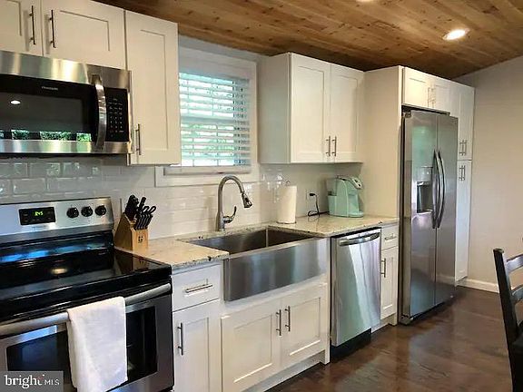 Welcome home to this recently renovated cabin with lake views located in desirable Lake Harmony, built on a corner wooded lot. The home features 5 bedrooms and 2 full baths. Walk in and immediately notice the hardwood floors throughout accented by the double French doors that lead out to a beautiful wraparound deck. Here you find your main living area and dining area. In the back of the area, you will find the modern kitchen with granite countertops, shaker cabinets, subway tile backsplash, farmhouse apron sink, and stainless-steel appliances. Down the hall you will find a beautifully designed hall bath accompanied by 3 bedrooms. Head to the lower level to find the second living space accented with a porcelain tiled TV wall. Down the hall you will find 2 additional bedrooms, a storage room, and the second full bath with laundry closet. The house has a newer forced-air HVAC system with central air. Furniture is included in the sale (some personal items will be excluded). The house is a short walk to the lake and is convenient to major Pocono attractions: waterparks, Pocono Raceway, casinos, Jack Frost Ski Resort, Big Boulder Ski Resort, rafting, hiking and so much more. STR Friendly. Public Sewer. No mandatory HOA. Rooms sizes and square footage of home are estimates and should be verified by buyer.