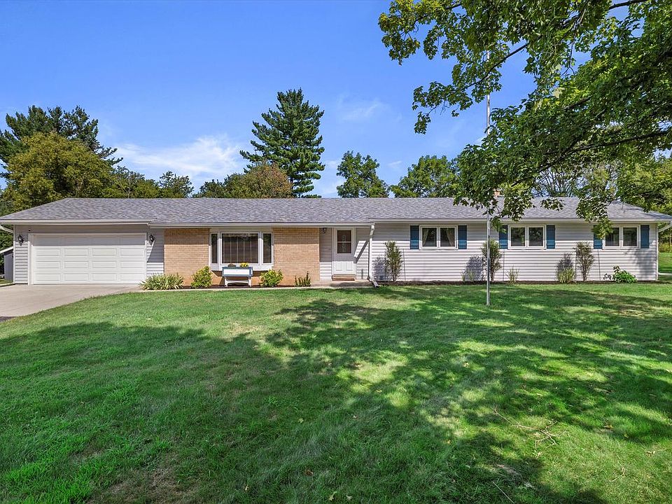 OCONOMOWOC. A rare opportunity! A nicely updated and well maintained mid-century ranch home set on a private landscaped 2 acre lot with 3 separate garages offering 5 plus garage stalls. The garages are perfect for the car enthusiast or running a home based business. The home is in excellent condition with newer roof and gutters, new flooring and newer mechanicals and appliances. A 3 season room is the perfect spot to enjoy the privacy and solitude of this amazing home and grounds. The home features radiant heat and a High Flow Central Air System giving you the best of both worlds. Some of the other many features are: vaulted ceilings, open concept floor-plan, new floors, full basement, fenced yard and a hot tub.