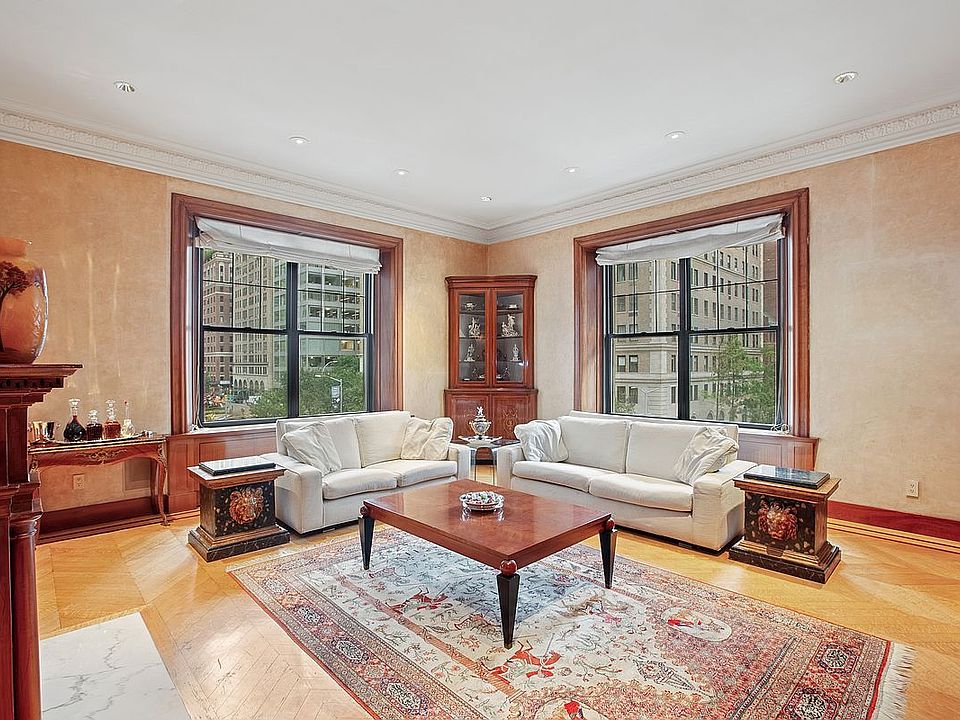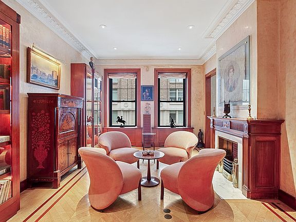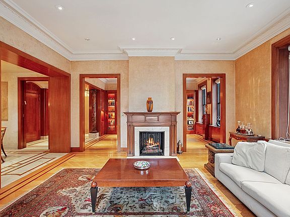 Bathed in natural light from its prized corner exposure, the home is defined by soaring 10.5-foot ceilings and sweeping vistas of Park Avenue that frame every room in grandeur. Each element reflects artisanal craftsmanship: chevron-patterned hardwood floors, ornate crown moldings, marble inlays, and bespoke hand-painted murals that celebrate a tradition of exceptional artistry.