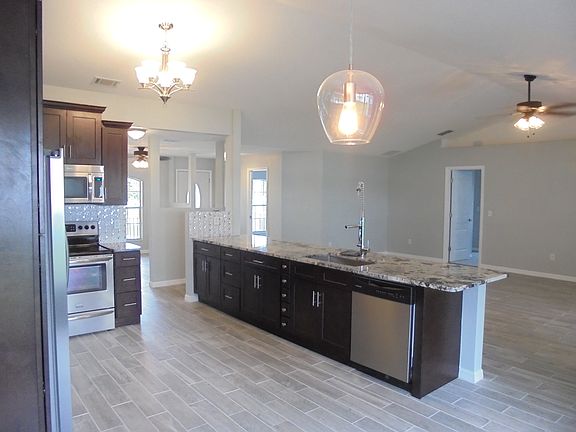 SELLER SAYS SELL NOW! INSTANT EQUITY! BELOW APPRAISED VALUE!!!! THIS HOME WILL NOT LAST LONG! If you are looking for a TV/Magazine ready home this is it. This 4 bed 2 bath modern home features an open floor plan, with formal dining room and contemporary accents throughout. The 4th bedroom is perfect for that home office or den. This home has custom mocha shaker cabinets with soft closures, upgraded granite countertops, under mount single bowl sink, commercial kitchen style faucet, new energy efficient appliances including dishwasher, microwave, range and refrigerator. Ceramic tile "wood look" floors, built in electric fireplace with flagstone wall accent. Modern European style floating vanities with waterfall faucets in all baths. Oversized master bath shower has double sliding glass doors, river rock flooring and glass mosaic inserts. Exterior features include all new landscaping, epoxy coated garage, lanai and front porch.