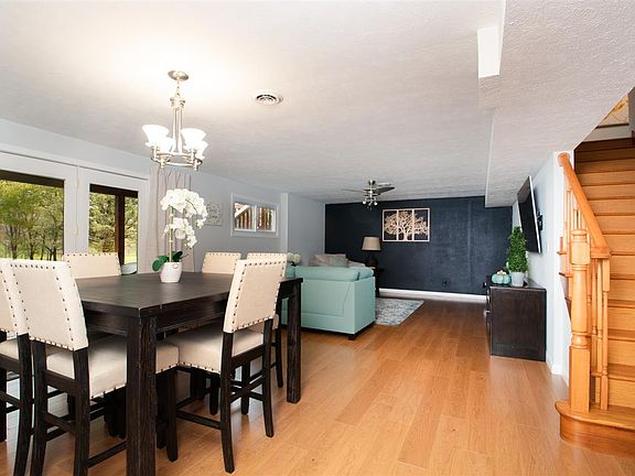 Updated & Ready to Go! Light abounds in this rural retreat. Close to highway but serene backyard. Nestled on a hill, this unique layout has plenty of room for family living and entertaining. Two decks and a porch maximize the view and setting. Move in ready! White woodwork, gray walls, and white bathrooms, gray carpet, wood laminate, and tile throughout. Main level has kitchen w/lots of counter and cabinet space. Dining area and family room with sliders to patio. Large mud room, full bath, large formal entry, and bonus space for office or storage. Laundry, mechanicals and more storage on main level. Oak open staircase leads to light filled upper sitting room, three large bedrooms and additional full bath. Master bedroom has sliders to deck for watching sunset. New roof, gutter and eaves on garage and home.