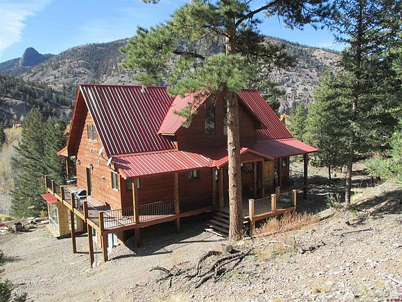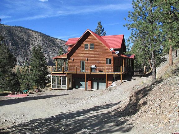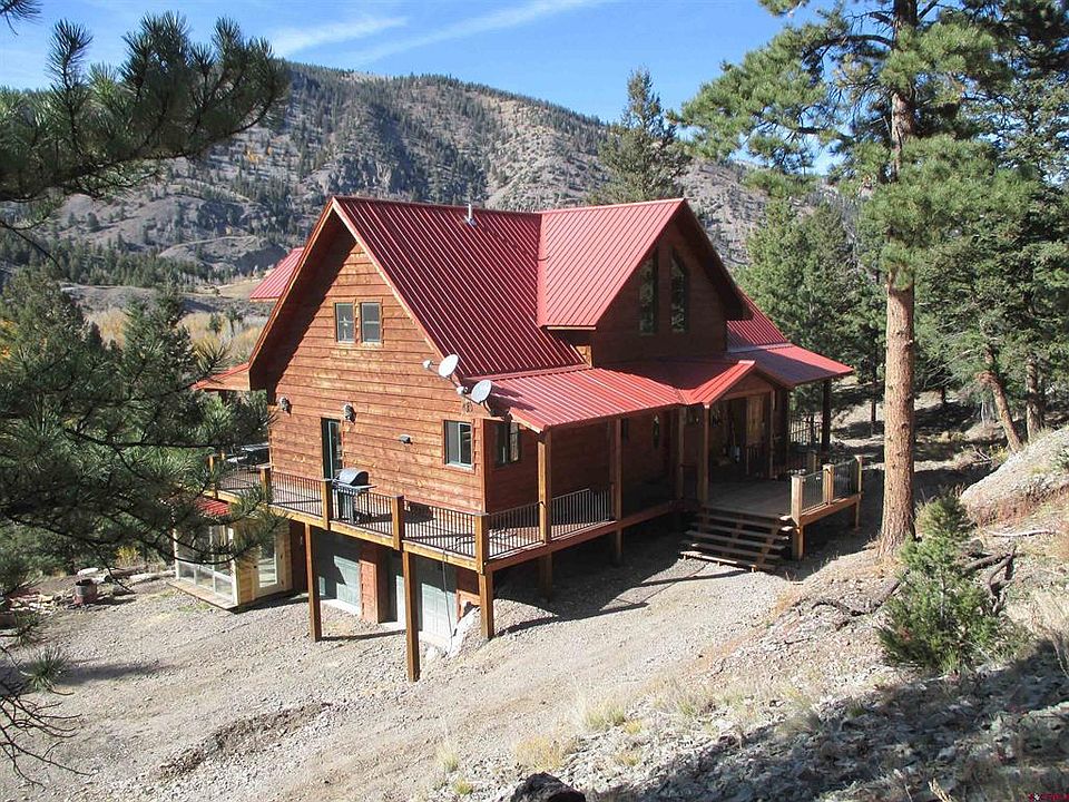 Nestled on the hillside among mature evergreens with 249' of Lake Fork of the Gunnison River frontage and incredible southwestern mountain views sits this custom built home situated on 2.24+/- acres in the Lake City Heights Subdivision of the Town of Lake City. This single owner 3-story stick built cedar sided home was constructed in 2010, and the detached 2-car oversized garage/workshop was constructed in 2018. The home offers 3,548+/- sq. ft. with 5 bedrooms, 3 1/2 baths, open kitchen/dining/living area with T&G ceilings, 2-story west facing Marvin windows rendering ample natural light & solar gain, ceiling fans, propane parlor stove in living area, granite kitchen countertops, custom knotty alder cabinetry, beetle kill wood floors throughout and efficient in-floor heat. The primary bedroom with French doors to the covered balcony is located on the main floor and offers a private full bath with shower, Jacuzzi tub, granite bathroom countertop, walk-in closet and slate tile floors. The 2 guest bedrooms are on the north and south sides of the upstairs open loft/office area with a shared full bath. The walkout basement with 9' ceilings has a large den area, 2 guest bedrooms, full bath and access to the enclosed sun deck and oversized 1-car garage. Additional amenities include a covered entryway, nice sized utility room with sink, front loading washer/dryer, ample storage throughout the home and a Generac generator that will be installed prior to closing. Enjoy the mountain views and wildlife from the partially covered deck with newly installed metal railings, or walk down to the river to enjoy some fly-fishing. The detached oversized 2-car garage/workshop is nicely finished with custom beetle kill wall paneling and has an efficient propane fueled Rinnai heater and ample storage upstairs. Although in a subdivision, there are no recorded covenants, HOA nor dues in Lake City Heights. This home would make a wonderful full time residence or Colorado vacation retreat. Please contact the agent to set up an appointment to view this property.