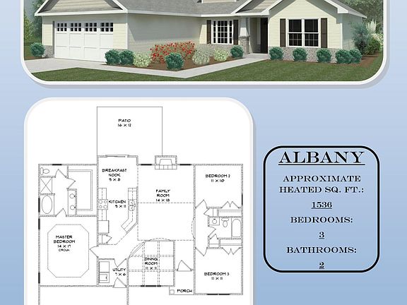 THE ALBANY FLOOR PLAN - APPROXIMATE HEATED SQUARE FOOTAGE IS 1536. 3 BEDROOM 2 BATHS WITH A 2 CAR GARAGE. IT'S A SPLIT FLOOR PLAN WITH AN AMAZING OWNER'S SUITE - HUGE WALK IN CLOSET - SOAKING TUB AND LARGE SHOWER. THE KITCHEN IS PERFECT AND INCLUDES A BREAKFAST AREA AND THERE IS A FORMAL DINING ROOM TOO!