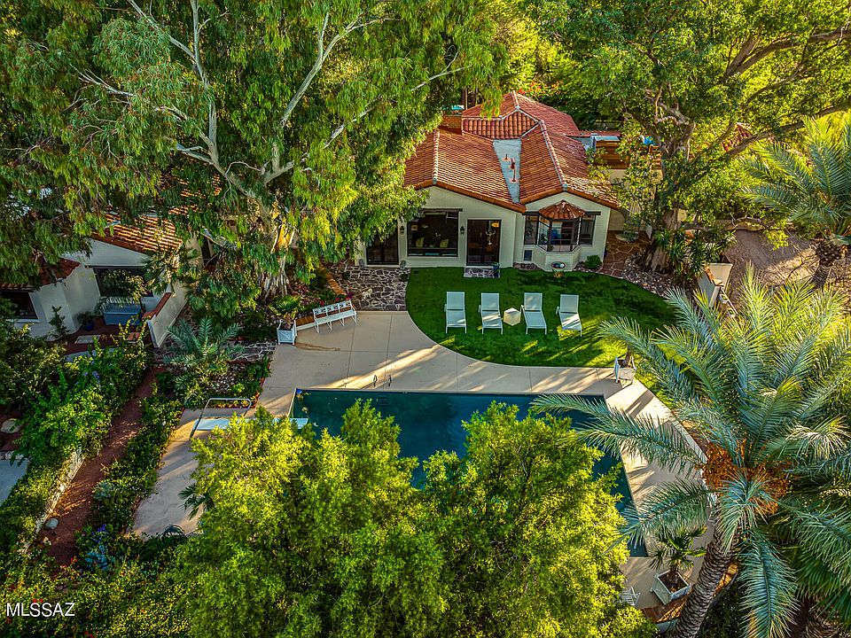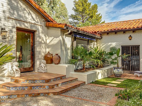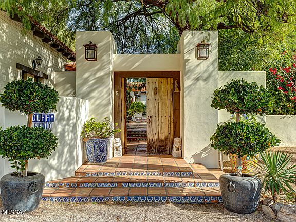 Stunning hilltop estate, inspired by Josias Joesler features over 3 privately gated acres with spectacular mountain views. Main home is almost 4,0000 sq ft with 4 bedrooms, 3.5 baths plus a fully finished basement as 5th bedroom. The split bedroom floorplan provides lots of privacy, and primary has its own library. Formal living and dining areas are accompanied by an extra large family room with a wall of glass facing the Catalina mountain range. The kitchen was remodeled just a few years ago and has both a small eat-in area and workspace. Both a charming front courtyard with fireplace and covered patio, and the extensive rear yard with large, heated diving pool and multiple sitting areas make this the ideal home for entertaining or just enjoying the outdoors. The guesthouse...(continued) is large enough for a full-time or extended stay guest with a separate bedroom, own laundry facilities, a full kitchen, and its own private covered patio with amazing city light views. In addition to the 2-car garage attached to the main home, there is also a car-collector's dream in the detached 4+ car garage that can house 3 car lifts, which has its own HVAC system as well. As a further bonus, there is a well on-site for the pool/landscaping while the living areas are connected to City Water. Please request a features sheet from agents for additional information and upgrades made to the home recently.