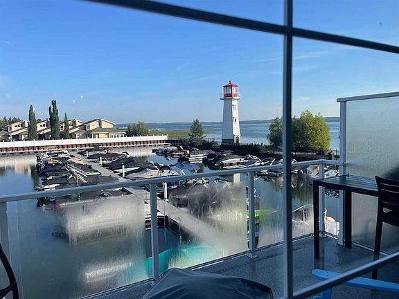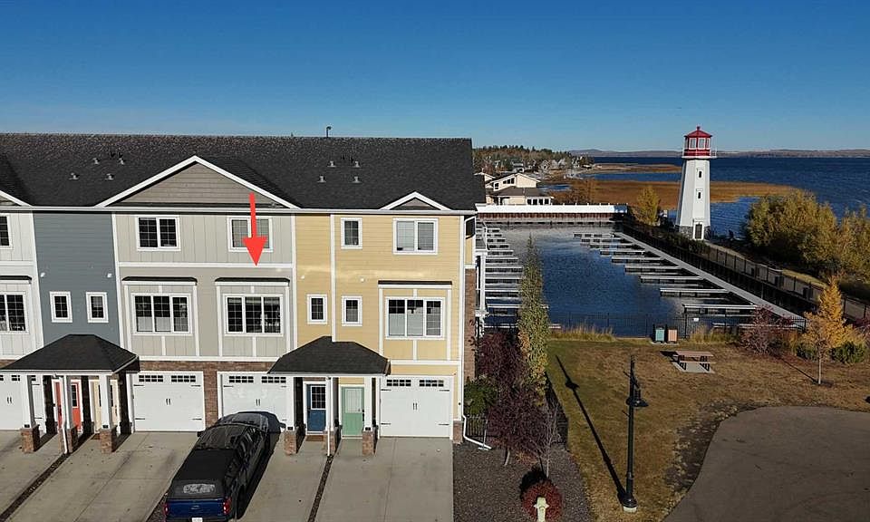 AFFORDABLE WATERS EDGE CONDO with reasonable low condo fees of $335/month ! Carefree lake front living at its finest, with stunning VIEWS TO WAKE UP TO and direct lake access! ONLY ONE UNIT AWAY FROM THE LIGHTHOUSE PROMENADE right on the lake and the marina and next to Friday FARMERS MARKET! This fabulous 3 bedroom 4 bathroom townhome with 9' HIGH CEILINGS and attached GARAGE/FAMILY ROOM is located right on the WATERS EDGE MARINA in Sylvan Lake. Enjoy the PLEASANT MORNING VIEWS and SUNSETS from the large upper deck and lower patio and WHILE LAYING IN BED.! This amazing GATED COMMUNITY property is just steps from all DOWNTOWN RESTAURANTS AND SHOPPING. There is a public park and beach area just steps from the front door, with the main beach and pier only a block away. The main floor consists of a heated single garage/family room with convenient 2 piece bathroom, a flex room (BEDROOM/GYM/den/office/bedroom/craft room) (this one bedroom/bath can also be used as a separate suite with it's own entrance), large storage closet, EPOXY GARAGE FLOOR finishing, and a rear access door to a covered concrete patio overlooking the Marina. The second floor is gorgeous with an abundance of natural light streaming through the windows that overlook the lake, finished in vinyl plank flooring,-ideal for lakeside living. The kitchen has ample cabinet and counter space-finished with QUARTZ COUNTER TOPS, soft close cabinets and stainless steel appliances (including a GAS STOVE with double oven) and REVERSE OSMOSIS drinking tap. Cozy up in the living room after a day on the lake in front of the inviting electric FIREPLACE, or enjoy the panoramic views from the large upper deck accessed from the the living room. Upstairs you will find two good sized bedrooms including a primary suite (with lake views right from your bed), a walk-in closet and a 5 piece ensuite, a second bedroom, a 4 piece main bathroom, and top floor LAUNDRY with washer/dryer completing the upper floor. CENTRAL AIR CONDITIONING will keep you cool on those warm summer days. Other great features include central vac roughed in, natural gas line to the upper and lower decks. WAKE UP HAPPY to be in such a paradise...one of the most affordable options for living right on the water currently listed for WELL UNDER 2025 Appraised value and Municipal Assessment (attached in documents) -SHORT TERM and long term rentals are allowed.
