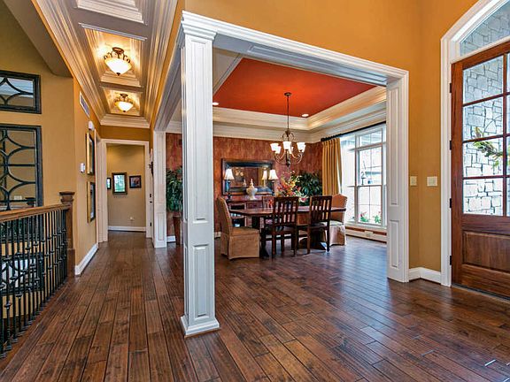 This award winning Homearama home with significant upgrades and a $3,000 painting allowance is ready for you! The open concept is the perfect home to entertain guests with an incredible bar area in the walkout basement. 5 bedrooms, 3 full and 2 half baths on a quiet cul-de-sac make this the perfect place to call home. The great room features a stone fireplace & beautiful towering ceilings. Hardwood floors are throughout most of the main floor as well as triple crown molding. The eat in kitchen features custom cabinetry, stainless appliances with gas cooktop and granite countertops. The large owner's suite is detailed w/ beautiful trim & a vaulted ceiling lead to a spacious master bath. Full irrigation system along with professional landscaping complete this beautiful home. The split floor plan offers privacy w/the other two bedrooms and a jack and jill bathroom across the home. Each bedroom has a spacious closet and bright windows. The first floor laundry and mudroom make it easy to do laundry or clean up from the garage. The WALKOUT basement is perfect for spreading out and having fun! It boasts a open family room, exciting bar with custom cabinetry and a 4th bedroom with a full private bath. The 5th bedroom also in the basement, currently being used as a home office, is perfect for extra flex space. Next up is the amazing theater room which can host watch parties or movie nights. There is an additional flex room which would easily be used for a playroom or craft room. Lastly there is another powder room as well! Outdoor amenities are a covered deck and covered patio which is enjoyable during the warmer months. The house is within walking distance to a fully equipped neighborhood playground. You will want to see this luxurious home today!