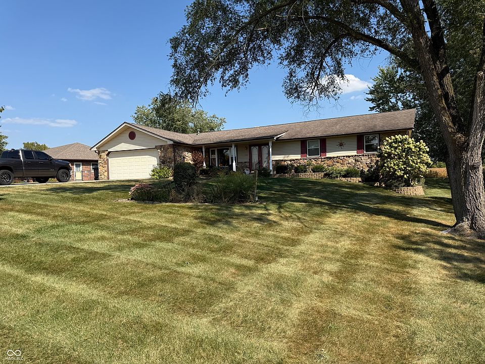 Nestled at 5210 S 100 RD E, Anderson, IN, this inviting home in Madison County stands ready to welcome you. The living room provides an amazing space to relax and unwind, complete with a fireplace to offer warmth and ambiance, while the high, vaulted, and beamed ceiling creates a sense of spaciousness. The kitchen features a kitchen peninsula, ideal for casual dining or entertaining, complemented by a backsplash and tray ceiling that adds architectural interest. The bedroom boasts a crown molding, adding a touch of elegance and sophistication. Be sure to check out the finished basement with daylight windows ready for game nights or watching the big game. Beyond the interior, the property offers a pergola and patio, perfect for outdoor gatherings, as well as a fire pit for cozy evenings under the stars, and a porch to enjoy the surrounding landscape. Leaf Filter gutter guards will help you stay off the ladder each fall and the electronic lock at the front door is perfect for helping friends or family gain access when needed. The storage shed has 110v power to make weekend projects a breeze. This single-family residence provides a unique opportunity to embrace comfortable living on a generous, private lot. You may feel like you are miles away from everything sitting on the back patio, but you are surprisingly close to retail, shopping, dining and interstate travel. Dishwasher 2025, light fixtures and paint 2025, new fans with remote controlled speed and lights 2025, septic service and well treatment 2025, refrigerator 2023.