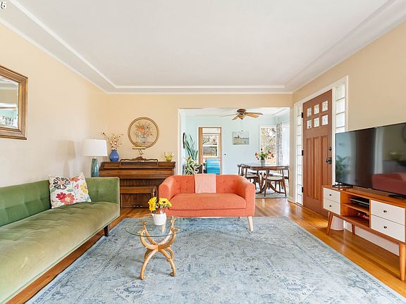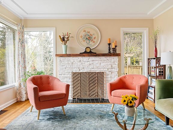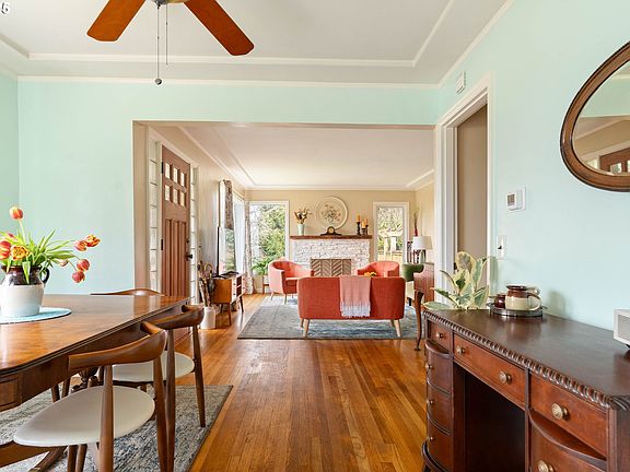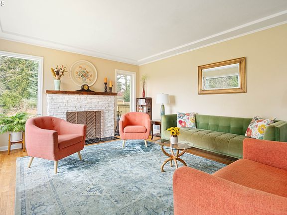 This charming 1941 mid-century home sits high above the street on a beautifully landscaped double lot, surrounded by vibrant flowers and raised garden beds. Thoughtfully updated while preserving its original character, this home offers a perfect blend of style and comfort. The main floor features hardwood floors, a welcoming living and dining area with a cozy wood-burning fireplace, and a stylishly updated eat-in kitchen. Two spacious bedrooms and a beautifully renovated bathroom complete the level. The lower level provides additional living space with a warm and inviting family room featuring a gas fireplace, a private bedroom, a second full bathroom, a laundry room, and custom built-in cabinetry for extra storage. Adding even more value, the newer detached oversized garage includes a bright and airy one-bedroom ADU above—ideal for guests, short or long term rental income, or a private retreat. Enjoy stunning views of the West Hills from this incredible property, located in the highly desirable Woodstock neighborhood. With a Walk Score of 71 and a Bike Score of 94, you’re just blocks away from fantastic restaurants, cafés, and shops. This is a rare opportunity to own a beautifully updated home in one of Portland’s most vibrant communities. Open Saturday and Sunday 12-2! [Home Energy Score = 7. HES Report at https://rpt.greenbuildingregistry.com/hes/OR10009370]
