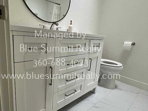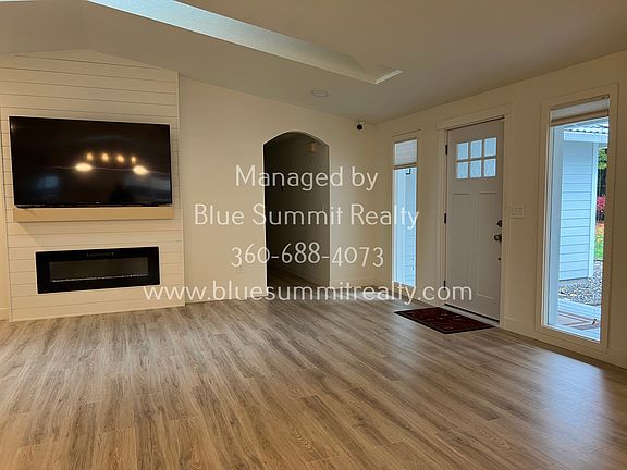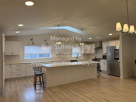 PENDING APPLICATION: Discover this beautifully renovated 3-bed, 2-bath rambler located on a large .9 acre lot, featuring an open-concept layout with vaulted ceilings, skylights, luxury plank flooring, and a fireplace. The stunning chef's kitchen offers white shaker cabinets, quartz countertops, a massive island, stainless steel appliances, and designer lighting perfect for cooking and entertaining. Both bathrooms have been fully updated with contemporary tile, quartz vanities, and upgraded fixtures. Enjoy abundant natural light throughout, a spacious two-car garage, low-maintenance landscaping, and easy access to shopping, dining, parks, and I-5. A quick commute to JBLM. All personal items will be removed prior to tenancy including TV, NO USE for shed. Please visit our website for Blue Summit Realty and check out our Property Management- Learn More page to see our rental criteria. Contact our office with further questions and for a prescreening to potentially schedule a tour. We do not accept portable screening reports.