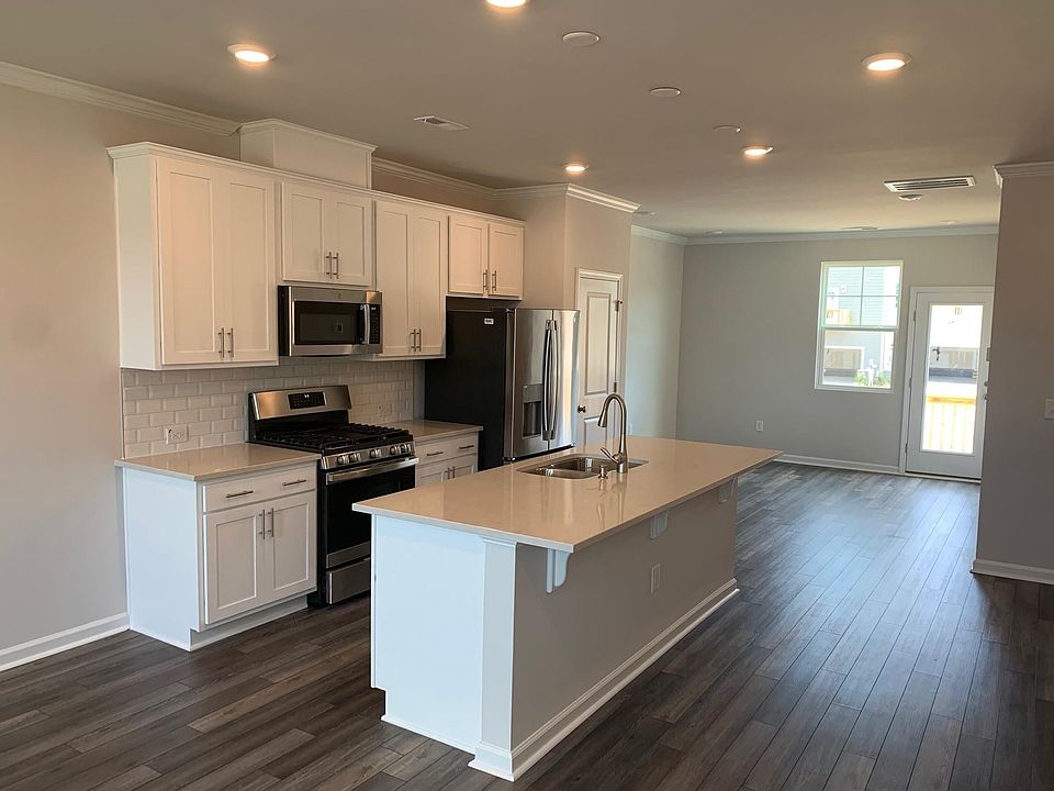 New end-unit townhome move-in ready late December located on Invention Way in the popular 5401 North community. Enjoy the convenience of North Raleigh from this new home. Quartz kitchen countertops, gas range, welcoming kitchen island. 1st floor bedroom and full bath. EVP floors, open railing on 1st and 2nd floors. Upstairs owner's suite includes walk-in shower with tile walls and seat. Walk-in closet. 3rd bedroom suite with own bathroom and walk-in closet. Connected Home package Ring video doorbell, alarm hub, smart garage system, Flo by Moen, and more. Pool and Clubhouse with fitness room in community.