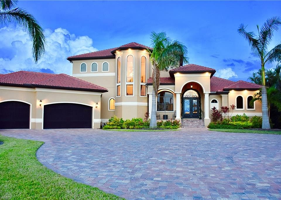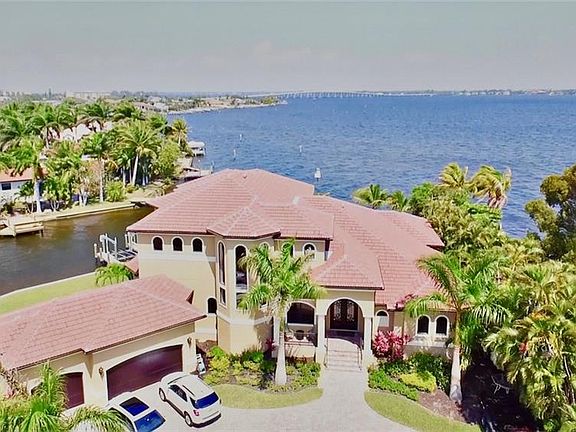 Best view in Cape Coral!! This magnificent 2016 built, two story river front property has it all! The outdoors boasts an oversized infinity edge pool with swim up bar, spa, outdoor kitchen, gas fire pit, 3 boat lifts, captains walk, second floor balcony, large circular interlocking driveway and beautifully landscaped yard. Inside contains high tray ceilings with LED lighting, 2 master suites, 2 additional guest rooms with en suites, home office, exercise room, media room, granite throughout, wine cooler, ice maker and so much more! This is a boaters paradise close to dining, entertainment and shopping. Wake up to exquisite sunrises and enjoy paradise living at its finest.
