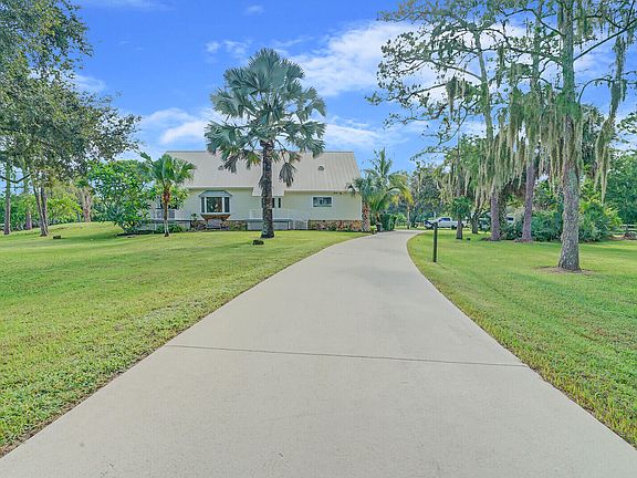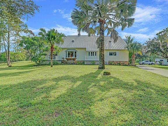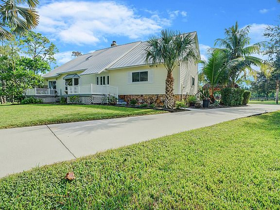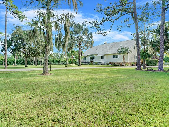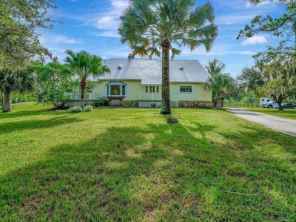 Welcome to this exquisite 4-bedroom, 3-bathroom modern farmhouse, with office that can function as a 5th bedroom, nestled in the highly sought-after equestrian community of Homeland. This beautifully decorated home has been meticulously updated throughout, exuding a bright, light-filled ambiance. Set on a picturesque 5-acre private lot adorned with lush landscaping and shade trees, this property is a true haven. The home features partial impact windows and a durable metal roof, ensuring both safety and longevity. The inviting living room boasts vaulted ceilings lined with white-washed shiplap. Just off the living room, a cozy den with charming wood-burning fireplace gives access to a serene screened-in porch overlooking the barn. Equestrian enthusiasts will be delighted by the impressive 6-stall barn complete with newly fenced paddocks and three large turnouts. There's ample space to create your own equestrian facility ring.