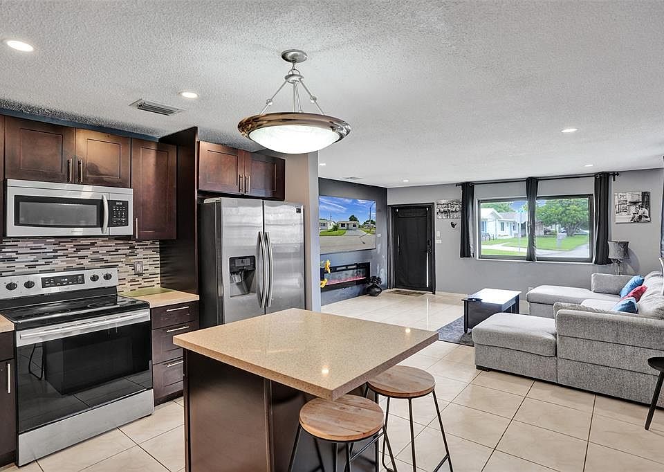 Beautiful updated home on corner lot ready for immediate occupancy. 3+parking spaces/1 covered carport. All new tankless water heater, electrical panel, stainless steel appliances & quartz counter tops. Remodeled kitchen & bathroom w/Rainfall shower. LED bathroom mirror w/touch feature. Recess lighting in living/kitchen/bathroom. Ceiling fans in bedrooms. Roof 2016, AC 2021. Open to all ages. HOA FEE: $81 per month includes (lawn/sprinkler, pest control, pool/club house).Less than 2 miles from new inter Miami CF stadium. Only 5 miles from the beach! Located between the turnpike & I95. 220V plug in laundry room can be used for electric car charging. Florida room can be used as office/den. Call listing agent to make an appt.