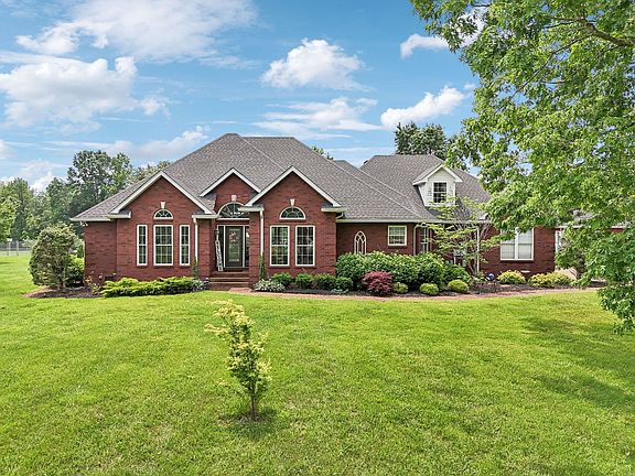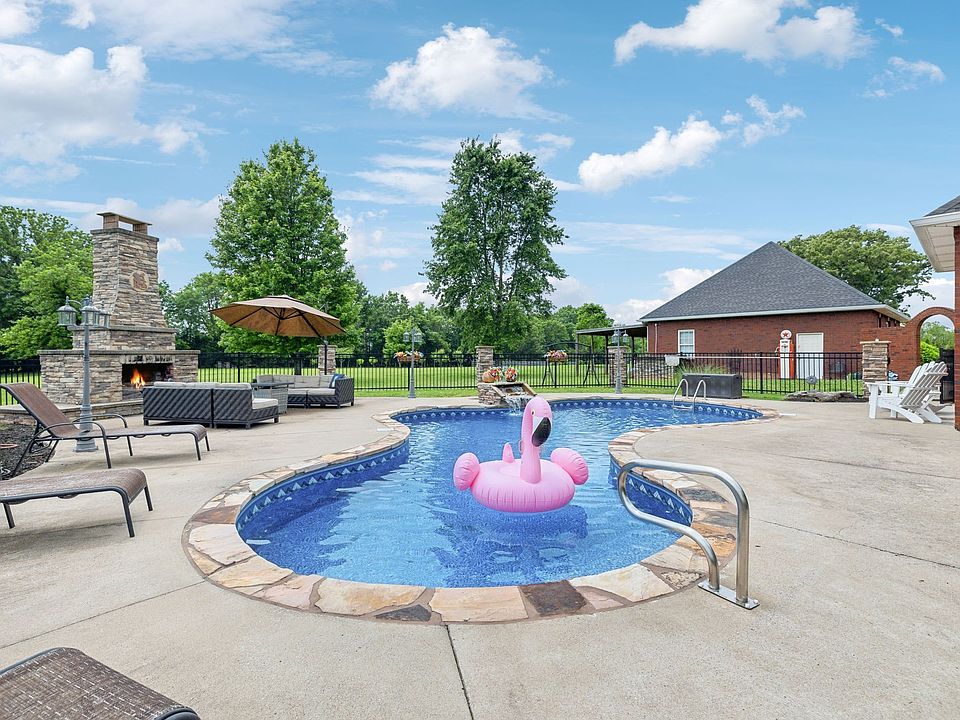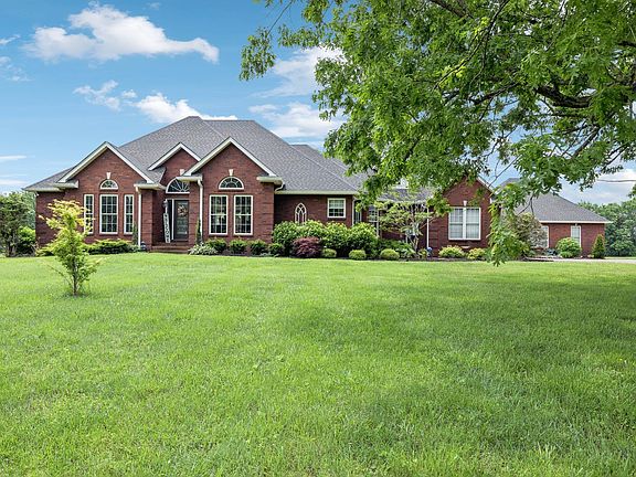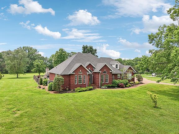 Welcome to this elegant traditional all-brick home nestled on nearly three pristine acres, boasting an in-ground swimming pool and located in Mount Juliet's beloved Gladeville community. The luxurious primary suite offers a dual-sided fireplace and access to a covered patio. The spacious kitchen features custom cabinetry, granite countertops, and stainless steel appliances. All bedrooms are conveniently situated on the main level, alongside a formal dining area and office space. Natural light floods the interior through many windows, offering sweeping views of the pool and outdoor fireplace from the formal living area. For those who love garages, this home has it covered with a total of six garage bays, including a detached three-bay garage with a storage loft and a covered boat parking pad. You will want to see this beauty in person.