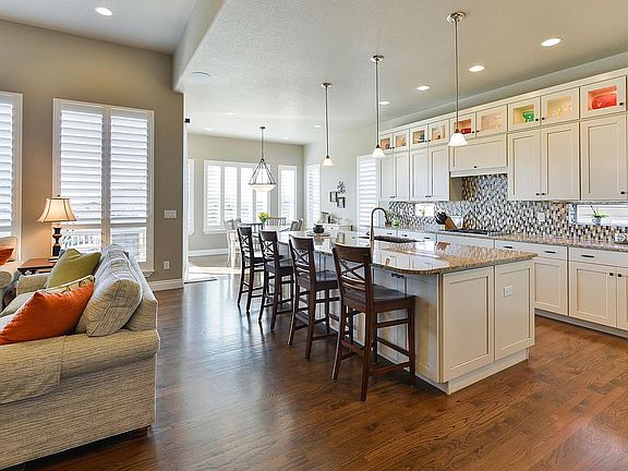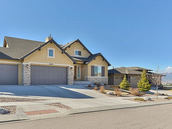Gorgeous former Saddletree model with amazing mountain views. The home features an open floor plan with 12' ceilings on the main level and 9' ceilings on the lower level. Walk in to a spacious entry with wood floors that expand throughout most of the main level. The kitchen is a cooks dream with granite counters, custom tile backsplash, huge center island with counter seating and cabinets on both sides, large pantry, gas stove, glass front cabinets and an adjoining dining area with lots of windows and a Pikes Peak view. The great room has built in shelving, gas fireplace with wood mantle and tons of windows. Main level master with views and adjoining spa like bath with granite counters, soaking tub, zero entry walk-in shower with rain shower head and large master closet with built-ins. A second bedroom and full bath and conveniently located laundry room complete the main level. The lower level has a huge second family room with built in shelving, game room area, and wet bar with tons of cabinets. The third bedroom is an additional suite with a walk-in closet and attached full bath. Also on the lower level is a fourth bedroom, another bath, and large storage area. The fenced backyard space is the perfect entertaining or relaxing environment. The upper deck has a covered portion with built in lighting and has been extended to take advantage of the Pikes Peak and Garden of the Gods view. A second deck provides additional space and there is a lower covered patio. Other features include plantation shutters on the upper level, air conditioning, custom tile work throughout and much more. The neighborhood has walking paths a nearby elementary school and middle school that is currently being built, as well as access to the community center with a pool and fitness center.