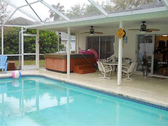 "NEW PRICE, REDUCED $5,000!!" This move in ready pool home says "Welcome Home" as you enter through the double doors in this Lake Bernadette Community. Home features tile flooring throughout. This great split bedroom plan also features a separate formal dining room as well as a dinette area. Big open floor plan for all your entertaining needs. Sliding doors compliment the Great room, Dining Room and Master Bedroom which all lead out to the screened in pool and stand alone hot tub. Master bathroom features a garden tub, separate shower and water closet with sink. Inside laundry room comes with washer and dryer. This home has all the features you have been looking for.