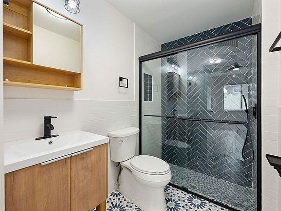The apartment comes with three spacious bedrooms, each equipped with large closets and ceiling fans. The master bedroom features a beautiful en-suite bathroom with a sleek and modern shower, while the other two bedrooms share a second full bathroom with a tub and shower combination.