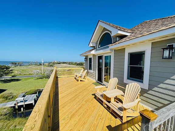 Welcome to Frisco Bliss - your very own paradise - where spectacular amazing sunsets will captivate your soul! Nestled on a waterfront paved private road this meticulously maintained move-in-ready home makes a perfect launch for kiteboarding, kayaking, and paddle boarding. Avid fishermen and watersport enthusiasts will especially love the boat dock with extra easy access to the Pamlico Sound. Adjacent to one of the most prolific fishing spots on Hatteras Island, citation drum, trout and Carolina blue crab have been happily harvested here just steps away from this homes front door. Minutes from the pristine Frisco and Hatteras beaches, this home will make a perfect vacation getaway equipped with all you need to relax and enjoy the magical beauty of the Outer Banks. The top floor with its expansive open floor plan living, features a beautifully crafted ship-lapped ceiling in the dining area, custom lighting, new stainless-steel appliances, solid maple cabinets, granite countertops and tile flooring in the kitchen, built-in gas fireplace, hardwood flooring in the living area, artfully created live-edge cedar wood stair railing, as well as a convenient powder room. The bottom floor primary suite features a large bonus room, perfect for an office/study, and a newly renovated full bath. Enjoy a soak in the hot tub while watching the soaring birds and sound side wildlife panorama. The ground level features a convenient huge outside shower with a changing room, a private boat dock with lighted fish cleaning table, a garage with auto door opener, workbench, refrigerator-freezer combo, extra large storage area and more deck space for grilling while overlooking your spacious back yard. With the brand-new air conditioning units, all of the recent updates including a new excellently-built deck, solid hardwood floors throughout, custom premium windows, Smart-Lap siding, and all the extra unique quality craftsmanship, you will enjoy peaceful relaxing living in your very own waterfront, turn-key Hatteras Island home.