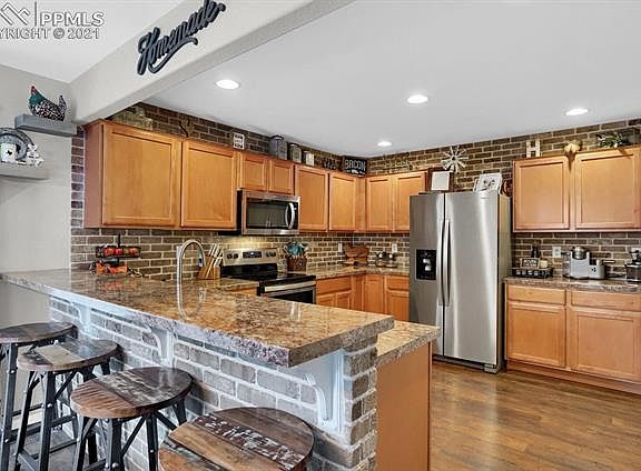 Beautiful home with custom finishes, walking distance to the park! Don't miss your opportunity to see this open and updated home in the desirable 80922 area! Modern colors, and rustic charm come together with gray and brown tones throughout. The large upstairs master, has a private full bath and walk in closet, and share the upper floor with 2 more bedrooms, In the basement you'll find a family room (currently used as a bedroom), a 4th bedroom, full bath and large laundry room with storage. The main level brings all the conveniences for entertaining and easy living. Dark solid flooring, and tall ceilings set the groundwork for the custom upgrades. New light fixtures, and custom masonry throughout the kitchen and dining area, are a statement to wow your guests. Two steps outside you'll find your large stamped concrete patio with gas firepit and pergola with bar and electricity! There is no excuse not to have that awesome backyard barbeque! The heated garage also has custom upgrades including paneled walls and plenty of workspace! This won't last long so schedule a showing today!