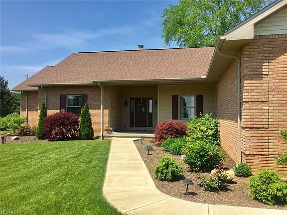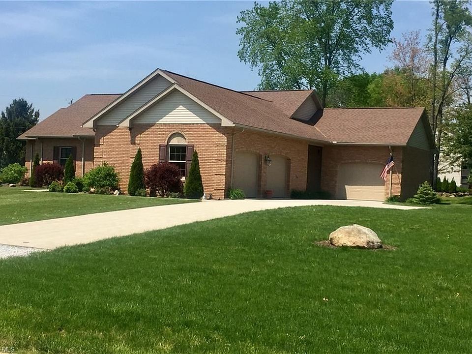 Truly custom Quality built brick ranch home with extra attention to detail. Light & bright open floor plan with 9 foot ceilings throughout. Huge foyer entry leads to great room with cozy fireplace, loads of charm all open to oversized dining area and custom gourmet kitchen that offers top-of-the-line cabinetry, granite counters, breakfast bar, pantry, and ceramic tile, plus professionally filtered water system. Enjoy entertaining inside or out with the huge covered back patio wired for phone and T.V, fire pit, and beautifully landscaped yard. Or enjoy the quiet front porch with country setting. Situated on almost an acre of land with scenic views all around. First floor living at its best with three oversized bedrooms and 2.5 baths set apart with their own foyer entry all offering walk-in closet'. Huge master suite with double walk-in closets and glamour bath that offers dual vanities garden tub, separate shower and more! Second bedroom has bath entry for privacy. First floor Study/Office could be set up as formal dining or 4th bedroom. First for laundry with another large foyer entry from the third porch area this home has so much to offer including a massive lower level ready for finishing that has two entries one from the home and one that walks out to the third stall garage. Highly efficient zoned Heating and cooling along with softened water system, custom woodwork and ceramic tile throughout, 6 panel solid doors. There is just too much to mention this is a must see!