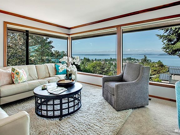 Perched above Alki Point, this classic mid-century gem wraps you in peace, quiet, and big PROTECTED VIEWS! Puget Sound and the Olympic Mountain range create panoramic wonder from your private retreat. Classic architecture blends seamlessly with modern convenience to create warmth, style, and comfort. Huge wood-wrapped windows and French doors bathe living spaces with natural light. Bright, well-appointed Chef's kitchen w/double ovens. Two wood-burning fireplaces. An expansive view deck. A massive family room. The primary suite offers a walk-in closet, window seat, and bath. An additional 2nd bedroom and full bath are located on the main floor, with a third bedroom and full bath on the lower level. Embrace privacy, style, and serene comfort.