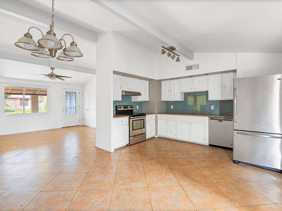 Affordable home, low taxes, no HOA, with modern touches, Newer A/C, Ceramic tile, laminate flooring, vaulted ceiling, North South exposure lot, freshly painted inside and out, kitchen with granite counter top and stainless steel appliances (included) Modern light fixtures and recessed light, touches Don't miss this 3 bedroom home with large eat in kitchen, large yard with huge covered patio. This home is located near parks, and ASU West. make it yours start now Please refer to the document tap for SPDS,CLUE, LBP and inspection report before submitting and offer