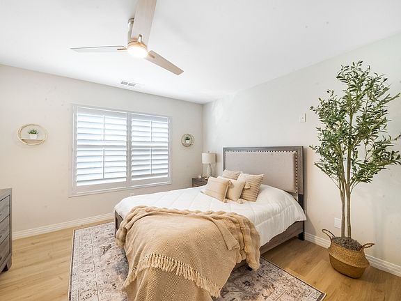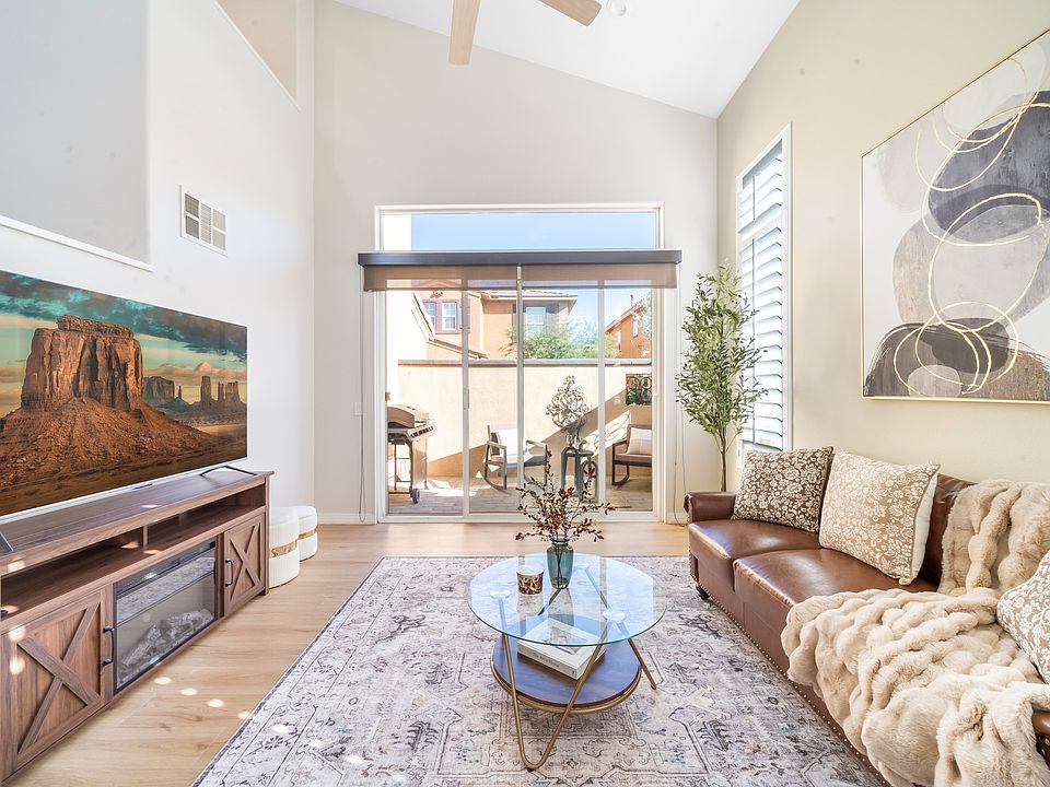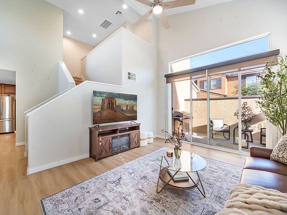 Enjoy gorgeous mountain views from the private gated courtyard. The interior features freshly painted walls, new vinyl wood-look flooring, and soaring 17-foot vaulted ceilings, creating a bright and spacious atmosphere. The great room opens to a private patio ideal for relaxing or entertaining.