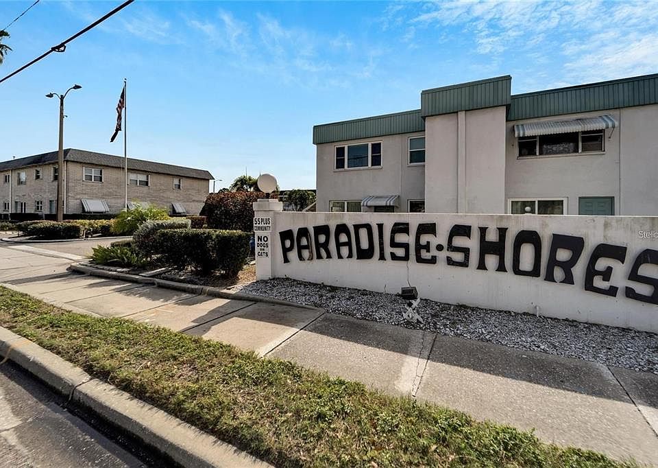 This is a ground-floor unit offering two spacious bedrooms in a 55+ community. From your covered parking spot, you enter the condo's Florida room, which features numerous windows; this area can be used as a home office or an additional bedroom. The kitchen is a nice size, featuring Whirlpool appliances, a brand-new gas stove, perfect for all your cooking, and a large pantry. NEW HVAC! The kitchen opens into the spacious living area. The new electrical Panel gives you peace of mind for the years to come. Paradise Shores offers a variety of activities for you to enjoy. There is a pool, shuffleboard, library, billiards, ping pong, card/game room, and a clubhouse for parties, dinners, dancing, and so much more! The best part is you can walk to shopping, and a quick drive will take you to the malls, the VA Hospital, and the sunny beaches of Florida!
