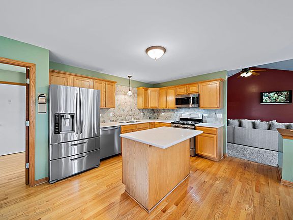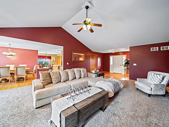 Welcome home to this stunning ranch home in sought out neighborhood, Cotton Estates. As you enter through the front door you are greeted with hardwood flooring along with vaulted ceilings cascading through a beautiful living room. On those cold evenings you will be cozy with your wood burning fireplace. The home has 4 bedrooms, 3 are on the main floor and the fourth in the basement with an egress window. 3 full bathrooms. The kitchen has SS appliances with a large island opening to a spacious dining room, as well as ample room for your breakfast table looking out to your grand deck with a composite flooring. The full finished basement has vinyl flooring along with a wet bar and an abundant amount of room for entertaining. The HVAC system was replaced in 2022 and the roof in 2019. Johnsburg School Dist. 12. Within the proximity of shopping, the Metra and the Chain of Lakes.