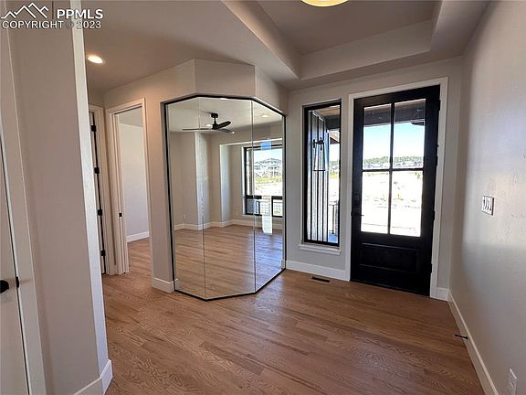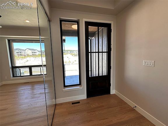 When outdoor mountain vistas are such a large part of the feeling from inside the home, it's best to let nature shine. Expansive black on black windows and over-sized sliding glass doors on the rear of the house allow you to soak in the views from this modern mountain masterpiece. The spacious covered front porch is the perfect place to enjoy the quiet evenings, while sipping on hot chocolate. As you enter, the first thing you notice is the gorgeous, custom front door. Once inside, the re-designed study offers an abundance of natural light with some clear glass study walls and massive windows. The great room features a vaulted ceiling with two alder beams, an upgraded fireplace complete with built-ins. Off the great room is the striking dining area with floor to ceiling windows and a dream kitchen. The large island is a gorgeous focal point with two stunning pendant lights above it. This kitchen comes complete with upgraded appliances, also features the most amazing prep kitchen. This comes complete with additional cabinetry, a second dishwasher and sink, making this the ideal extra space for entertaining. The main level feature a luxurious primary suite at the rear of the house and a comfortable junior suite at the front. The lower level is all about time with family and friends, with an upgraded linear fireplace, a gorgeous wet bar and large bi-parting doors for easy access to the backyard. Three more spacious bedrooms and two baths plus a powder room and an additional laundry room/storage area complete the space. This house is situated on a fabulous lot backing to open space and offering gorgeous views of Pikes Peak from the main and lower level. In addition, this home features uniquely customized spaces and loads of upgrades. Please note, the square footage, room sizes and specifications are approximate and should be verified. Taxes are based upon the land only.