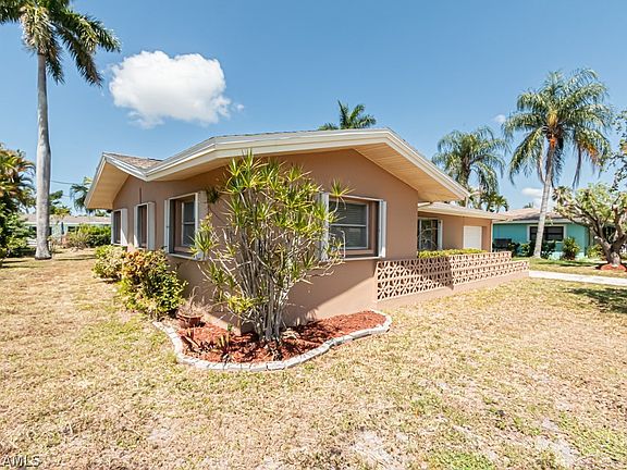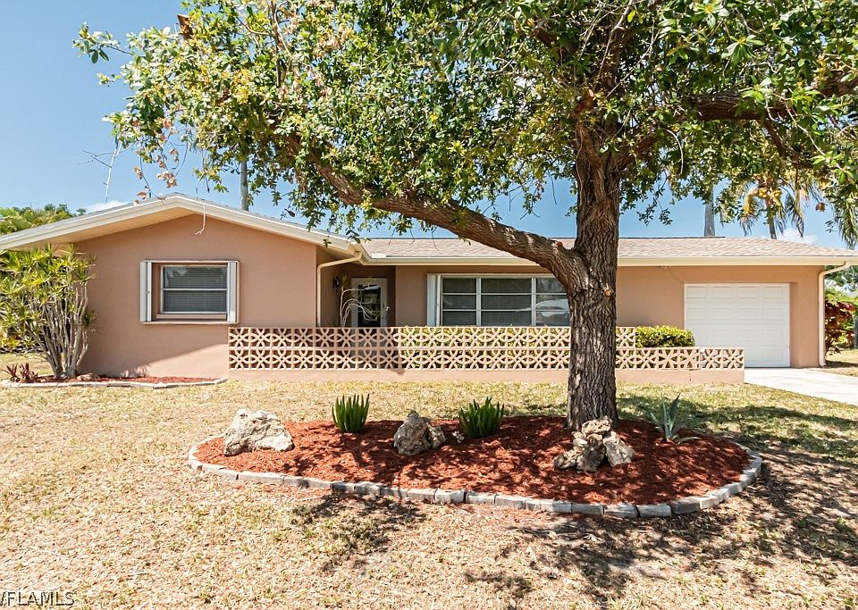 Welcome to your dream home! This updated 2-bedroom, 1 bath with breakfast nook, lanai and attached garage is a perfect cozy nest for a seasonal or full time residence. Step into a freshly painted interior/exterior and beautiful flooring throughout the interior. Kitchen has built-in cabinets, providing plenty of storage and a beautiful aesthetic. Indulge in the newly screened lanai that invites the outdoors in. The new AC system installed in 2023 keeps the indoors cool and comfortable. Storm shutters on all windows and slider door. This home, has a large back yard with plenty of room for a pool, garden and whatever you would desire for outdoor serene setting. This home is very near to the Cape Coral Yacht Club and beach. Great place to take your family and visitors for entertainment. Don't miss the opportunity to make it yours!