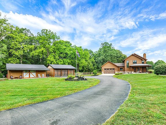Custom-built in 2018, this stunning home sits on 5 serene and private acres in Center Grove. Property offers 2 acres of woods, a 24x36 pole barn, and a detached 3 car garage with metal roof. Designed with attention to every detail, the gourmet kitchen features Kitchenaid appliances including built-in refrigerator, induction cooktop with pot filler, built-in microwave, separate ice maker, and a cast iron apron-front sink. Miller Maid cabinetry and custom lockers enhance the main-level laundry room. Two wood-burning fireplaces anchor the main level, each with mantels reclaimed from Indiana's oldest tobacco barn. The main-level primary suite offers tray ceilings, a walk-in closet with California Closet design, a tiled walk-in shower, and a soaking tub. Upstairs, you'll find three bedrooms-one with a private bath and two connected by a Jack & Jill-as well as a loft. The 9-foot-ceiling basement boasts two egress windows, an electric fireplace, gym, office, and a versatile craft room (or future bar). Systems include dual Bryant 19 SEER heat pumps, a 50-gallon heat pump water heater, and 400-amp service. Outdoor living shines with a fully fenced backyard, stamped concrete patio with firepit, greenhouse, and an outdoor kitchen with built-in griddle, gas grill, and ice box. Relax in the hot tub with luxury seating under dusk-to-dawn lighting for both the exterior and stairwell. Real hardwood floors, thoughtful storage, and unique historic touches make this truly a one-of-a-kind property.