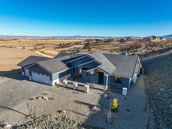 Gorgeous new 3 bed, 2.5 bath home on a view lot in Granite Dells Estates that is ready for move in today. Single story split floor plan with high end finishes and soaring ceilings. Large front patio with nice views to the West. You walk into beautiful luxury vinyl flooring in most areas and custom tile in the bathrooms. The wonderful spacious kitchen comes with quartz counter tops, stainless steel appliances, custom cabinetry and a walk in pantry. Enjoy more quartz throughout the home including the bathroom and laundry. Large master suite with a perfect bathroom. You'll love the soaker tub, large walk in shower, double sinks, vanity, walk in closet and tons of storage. The backyard has a lovely covered and uncovered patio, tons of pavers, and a view fence framing the great views.