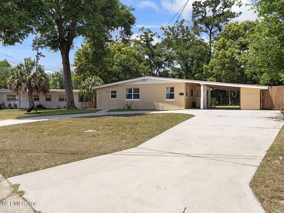 Attention all first-time homebuyers: Your perfect starter home awaits in this charming 3-bedroom, 1.5-bathroom residence with a versatile office/playroom/Florida room featuring French doors. A Big Fenced Backyard—ideal for family gatherings, barbecues, or simply unwinding in the sunshine, awaits you. The circular driveway assures you'll be able to fit everyone's car with off street parking! Stay cool & comfortable with ceiling fans in every room, while the convenient carport and storage room offer ample space for all your belongings.