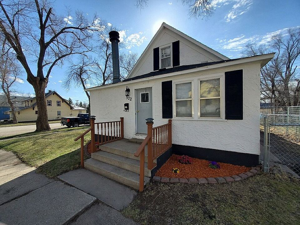Cozy 1 1/2 story home with updates including flooring and painting. Main floor has over 1000 sq ft for the kitchen, dining area, large living room with wood burning fireplace. Also two bedrooms and updated mainfloor bathroom. Upstairs has loft area, bedroom and 1/2 bath. 2 stall detached garage with a shop attached, all on a nice corner lot.