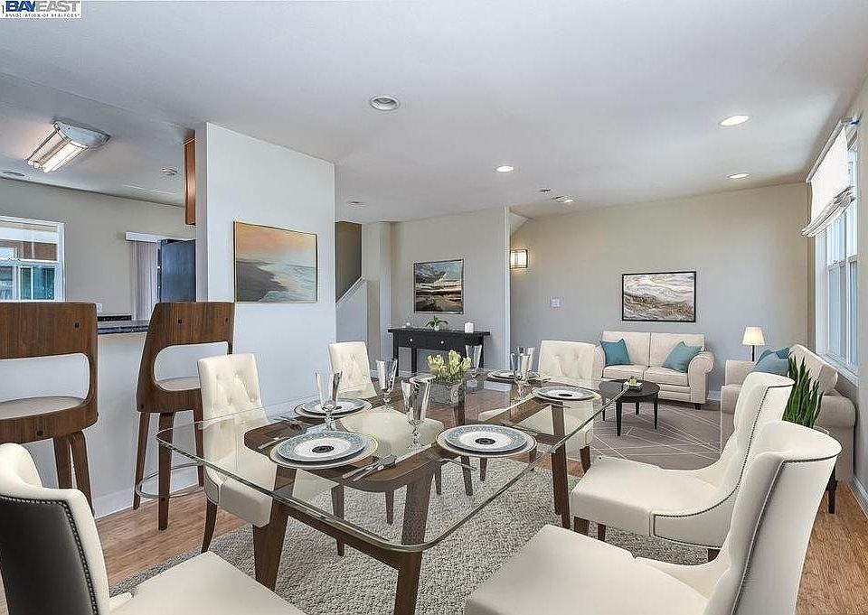 Just-refurbished townhome 1 block from West Oakland BART. Each of the 3 bedroom has its own bathroom--no need to share a bathroom with roommates. On the ground floor is a bedroom, bathroom, and one-car garage with washer+dryer. The second floor is an open-concept layout with hardwood floors, big double-pane windows and a slider door to the balcony/deck. Well-equipped kitchen with a brand-new gas range and nearly-new refrigerator. Also has dishwasher and garbage disposal. Third floor (new carpet) has two bedrooms, each with big double-pane windows, its own bathroom, and vaulted ceilings. The house looks like a rowhouse, but each house stands on its own with an air gap between it and the neighbor so noise isn't an issue. There is no yard, but there is a shared grassy area at the end of the common driveway where most neighbors leave their garbage cans. It's a good spot to take your dog if they need to relieve themselves at night but you want to stay behind the gate. Pets welcome on a case by case basis. No smoking. If you have an EV we can get the charger set up. The photos are from staging but the house is rented unfurnished. Showings by appointment. Available immediately. Lease is one year then month-to-month but I'm flexible if you have a particular situation. Pets considered on case-by-case basis. Owner pays garbage. Tenants pays water, PG&E, and EBMUD. Standard lease is one year then month to month, but I'm flexible if you have particular circumstances.