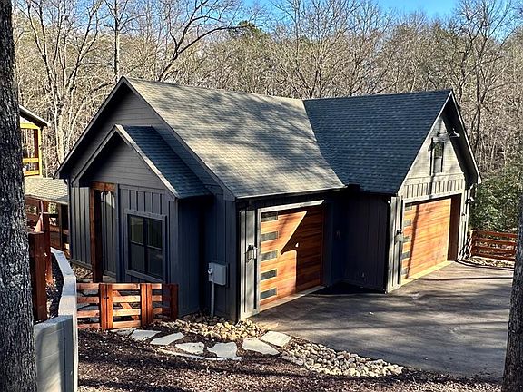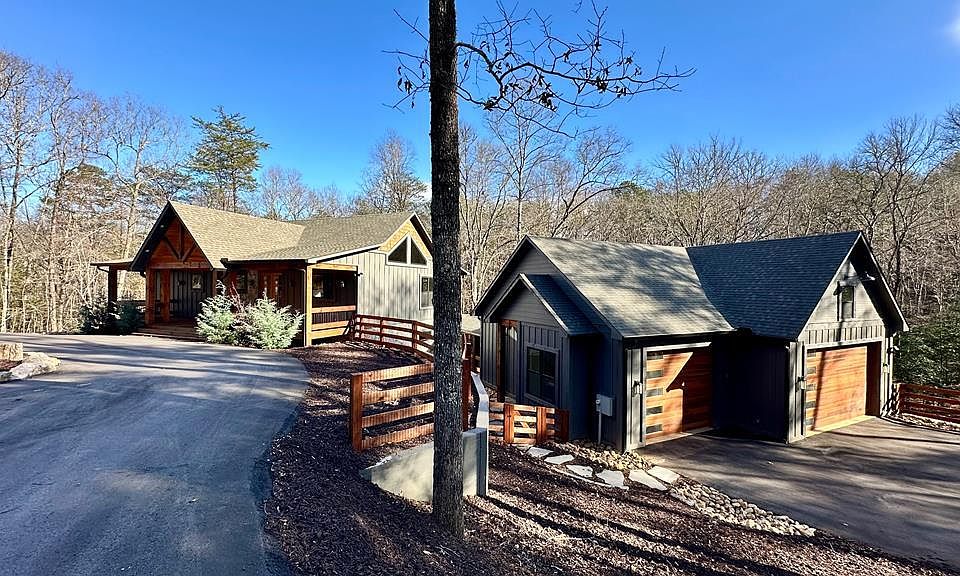Tucked away on 4.82 very private acres just minutes from Copperhill, TN, this exceptionally well-built home is designed for unforgettable indoor and outdoor living and offers craftsmanship that is increasingly hard to find. A large front porch is perfect for rocking chairs and relaxed mountain evenings, while multiple covered deck spaces elevate the outdoor experience, including a covered party deck with a fireplace off the main living area and an additional covered deck atop the detached garage that connects seamlessly to the main house. Inside, the main living area features vaulted tongue and groove ceilings with exposed beams, wide plank solid wood floors, modern lighting, and walls of windows, including clerestory windows that flood the space with natural light, anchored by a striking stone-clad fireplace with a quarter-log mantel. The kitchen showcases luxury finishes with an island offering seating for four and a pot filler above the range. The main level primary suite includes a spa-inspired bath with a freestanding tub, marble tile step-in shower with rainwater shower head, water closet, and walk-in closet. The fully finished basement adds flexible living space with a den, wet bar with wine fridge, polished concrete floors, two bedrooms, two full baths, a second primary suite, and a dedicated bunk room. All bedrooms feature king-size beds. Outside, the fenced backyard offers space for a future firepit, decks, and railings have been recently stained, including the underside of the upper deck, and a huge paved circular driveway leads to an over-the-top finished garage with vaulted tongue and groove ceilings. Offered fully furnished, including TVs with select exclusions and equipped with seven Ring security cameras, this meticulously maintained property delivers privacy, luxury, and superior construction. Schedule your private showing today!