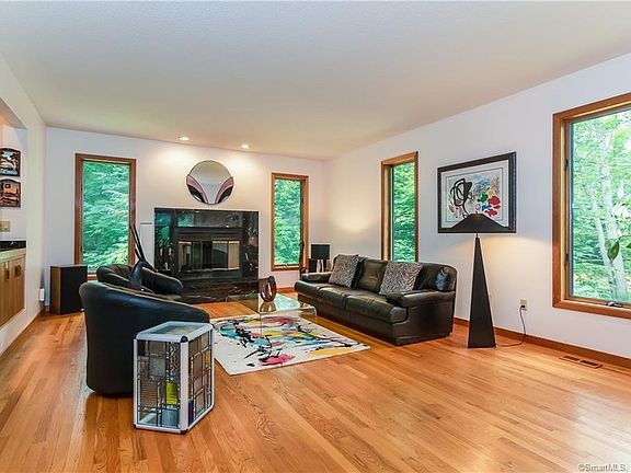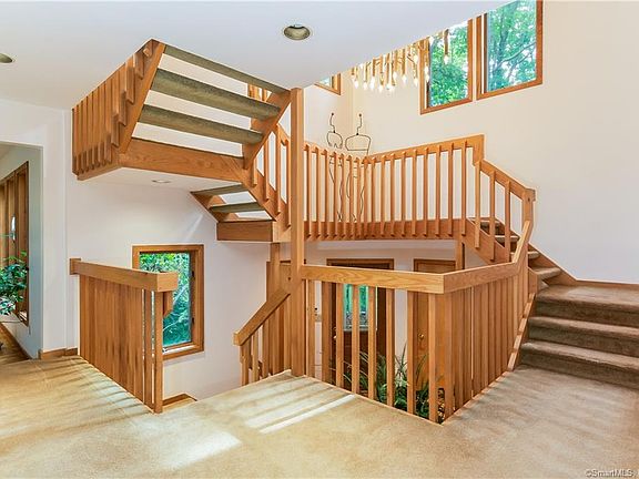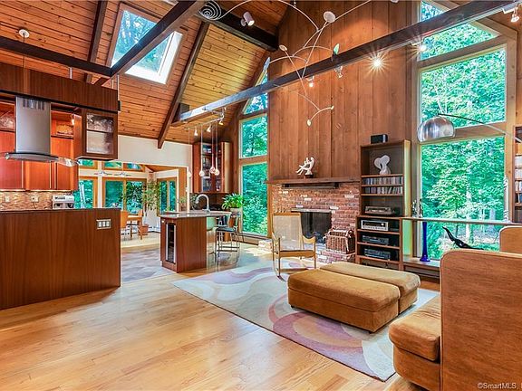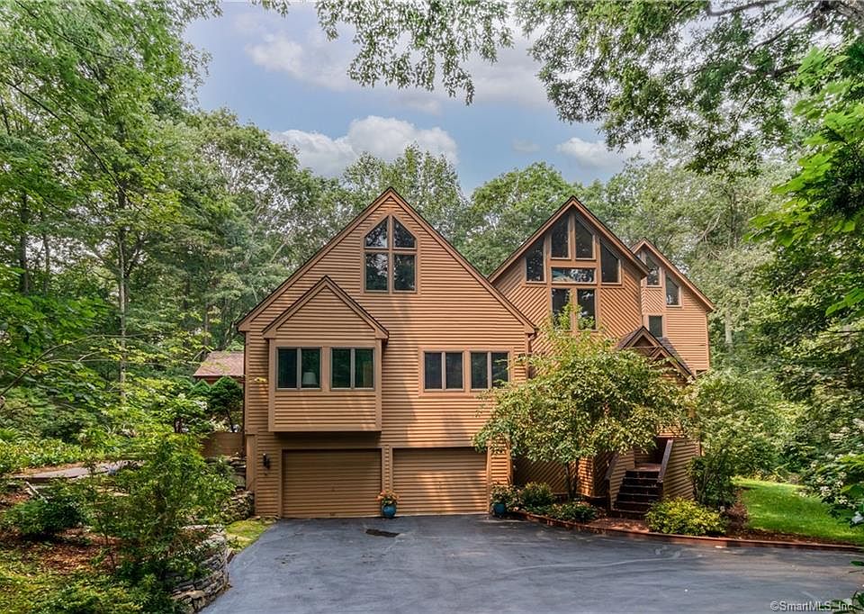 This lovely contemporary home was built in 1976 and has been expanded and updated. The main house is 3,246 square feet with a large 1,280 SF finished lower level. there is a nice balance of quiet, intimate spaces & bold open spaces. The use of soaring ceilings in the foyer, family room & primary bedroom set the dramatic tone. There are 73 windows in this house - most over-sized or custom sizes. As a result there is light everywhere. Particularly impressive is the custom kitchen with Africal Sapela wood cabinets, granite counters, glass tile backsplash & island. There is abundance of room for preparing feasts and the appliances, including beverage fridge, induction/electric cook top, double ovens, double sinks & a professional grade lighting plan make this kitchen pure pleasure. A bonus is the fully finished lower level. There are 3 finished rooms, plus laundry room & 2 sets of stairs from the 1st floor. With 2 bedrooms, a bath & a half on the 1st floor & the primary bedroom and en-suite bath plus guest room and another full bath on the 2nd floor there is truly room for everyone in this home. 240 volt in garage for electric car. Off the kitchen is a sun-room that opens on to a two-tiered deck w/views of the yard and surrounding woods. The plantings on this property have been planned for continuous bloom. Located on a cul-de-sac, abutting the West Woods & just minutes from the Guilford center, Bishop's Orchards & 20 minutes from New Haven. This great home is a real treasure.