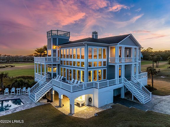 In the private beach community of Fripp Island, 522 Porpoise Drive enjoys a secluded setting at the end of Porpoise Dr. This premiere ocean and golf side home offers a panoramic 360 degree view and is comprised of nearly 4,900 square feet with four bedrooms, four full baths and two half baths. A wide stairway and waterfront porch lead to a beautiful foyer with a sweeping, curved staircase to the upper floor. The great room offers an 18 foot high coffered ceiling with a wall of windows overlooking the surf and is centered around a custom tabby fireplace created with Fripp Island oysters. Extensive built-in shelves and cabinets around the fireplace provide ample space for books, storage and a large television. All AV equipment was upgraded in 2021 with wireless control using HEOS.
