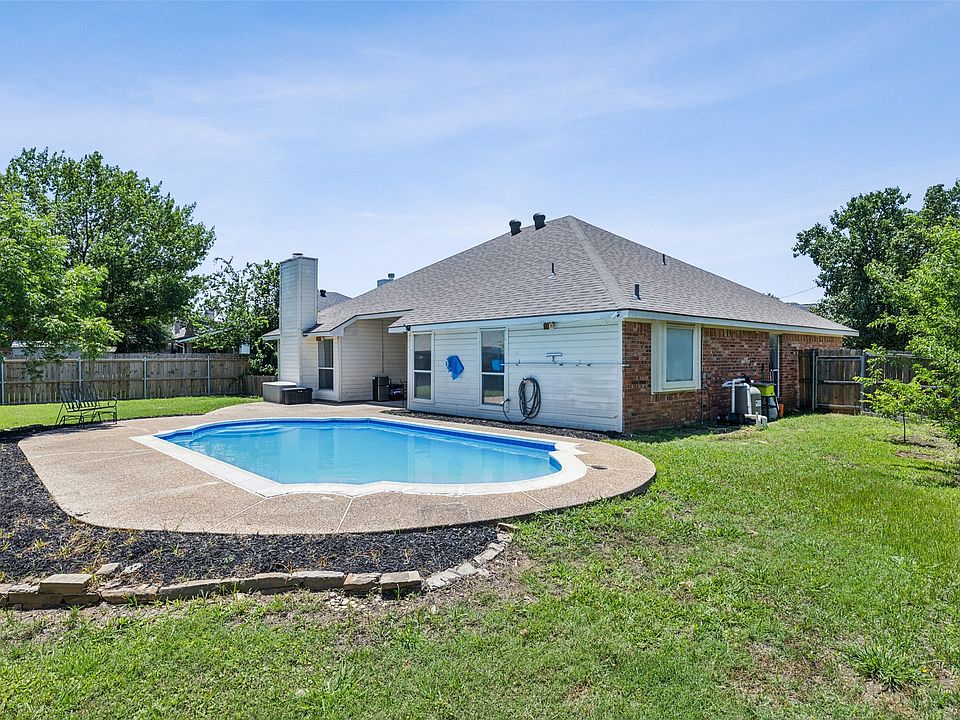Installed New Air Handler June 12th, 2025. This home boasts a fantastic LOCATION nearby Lake Lewisville and numerous appealing features. The private backyard is a true oasis, highlighted by a beautifully maintained SPARKLING POOL with a very recently REFRESHED SURFACE and NEW BORDER CERAMIC TILE. You'll also appreciate the NEW POOL PUMP and FILTER. The back porch is perfectly situated to enjoy the morning sun and provides full shade in the afternoon, making it a comfortable space year-round. The WATER HEATER is only 4 years old and is serviced every year. Home includes a Class 3 hail-resistant ROOF installed in 2022, which comes with a 40-year warranty for peace of mind. The HVAC system is under a strict maintenance plan with ABC Services, ensuring its reliability. Inside, you'll find TWO DISTINCT LIVING AREAS, ideal for entertaining guests. The home also features NEW FLOORING THROUGHOUT. The spacious kitchen offers built-in appliances, a convenient walk-in pantry, plenty of cabinet space, and a sunny breakfast nook complete with a coffee bar. A GORGEOUS modern, wood burning, NEWLY TILED FIREPLACE. The large primary bedroom provides a relaxing retreat with a cozy seating area, private access to the covered porch, and an ensuite bathroom featuring dual sinks, a soaking tub, a separate shower, and a walk-in closet. The fully INSULATED GARAGE offers great flexibility for parking, hobbies, or additional storage. Benefit from blazing-fast fiber optic internet connectivity. Situated in a quiet neighborhood within an excellent school district, this home is also conveniently located just minutes from Lewisville Lake, parks, shopping, and dining. This wonderful property is ready for you to move in and make it your own!